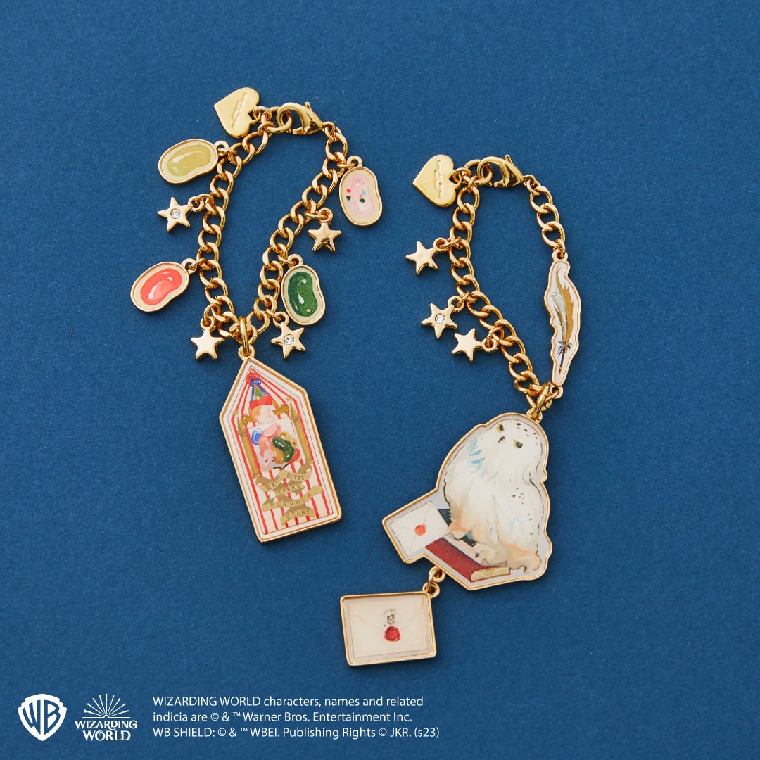 繊細な水彩画のアートを使用したバッグチャームとホグワーツ魔法魔術学校の4つの寮をモチーフやカラーで表現したファスナーチャーム。バーティー・ボッツの百味ビーンズ、ヘドウィグと手紙のモチーフがデザインされたバッグチャームは、バッグと組み合わせて楽しんでいただきたいアイテム。