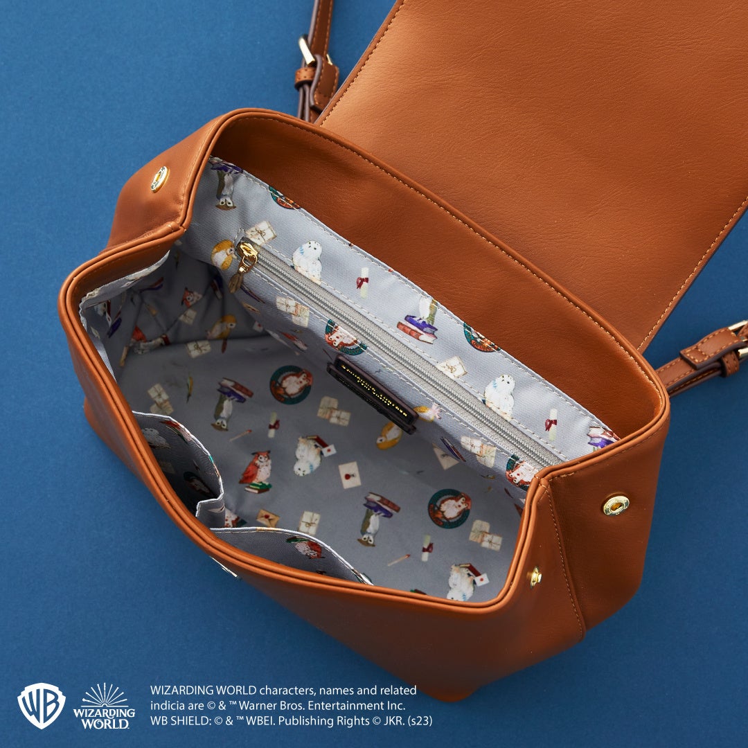 「ハリー・ポッター」の物語に出てくる、フクロウ便をイメージした裏地はフクロウたちの総柄になっていて、内側までこだわった仕様に。コーディネートも組みやすい、落ち着いたカラーでお出掛けバッグにぴったり。