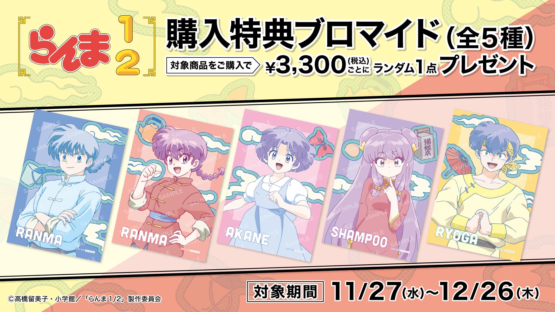 販売期間中(2024/11/27~12/26)、TVアニメ「らんま1/2」オリジナルグッズ対象商品を3,300円(税込)お買い上げごとに【購入特典】TVアニメ「らんま1/2」オリジナルブロマイド(全5種)をランダムで1点プレゼントいたします。
