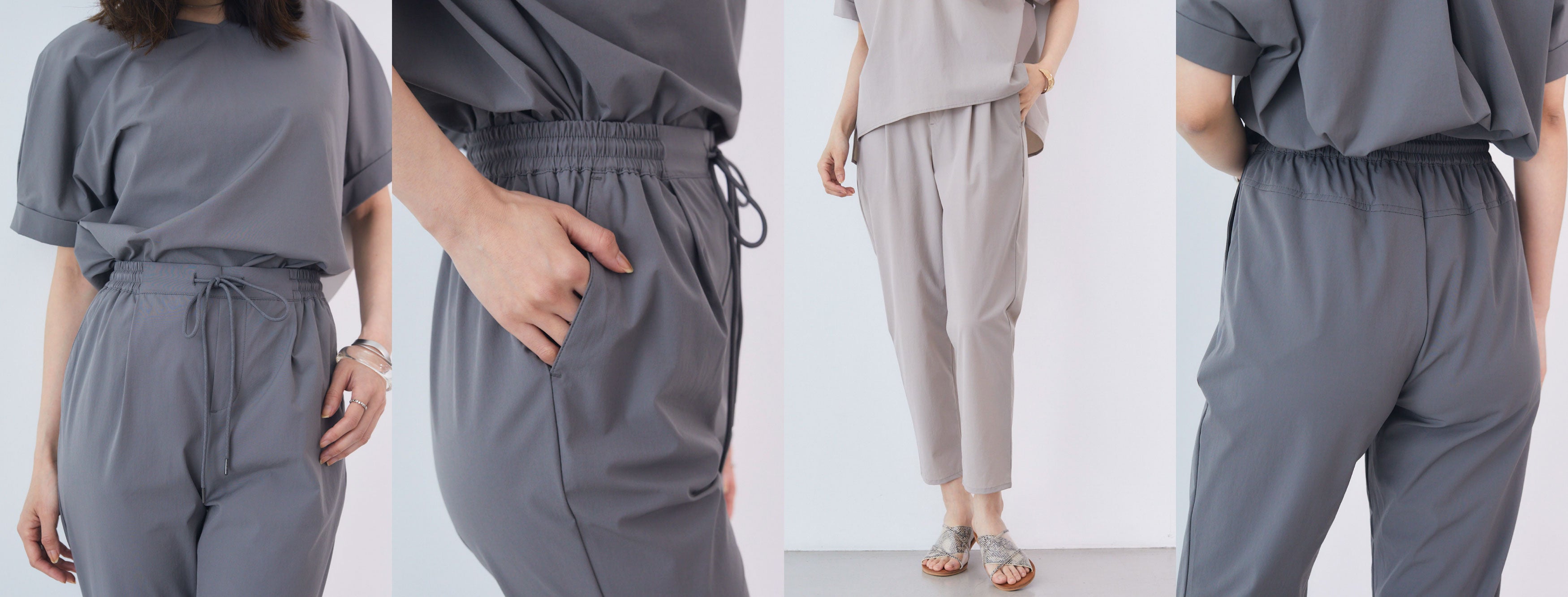 ウエストはゴム仕様で紐でサイズの調節可、両ポケット付き、くるぶし丈のテーパードタイプで、ヒールありなしともに足のラインがきれいに見えるデザイン。