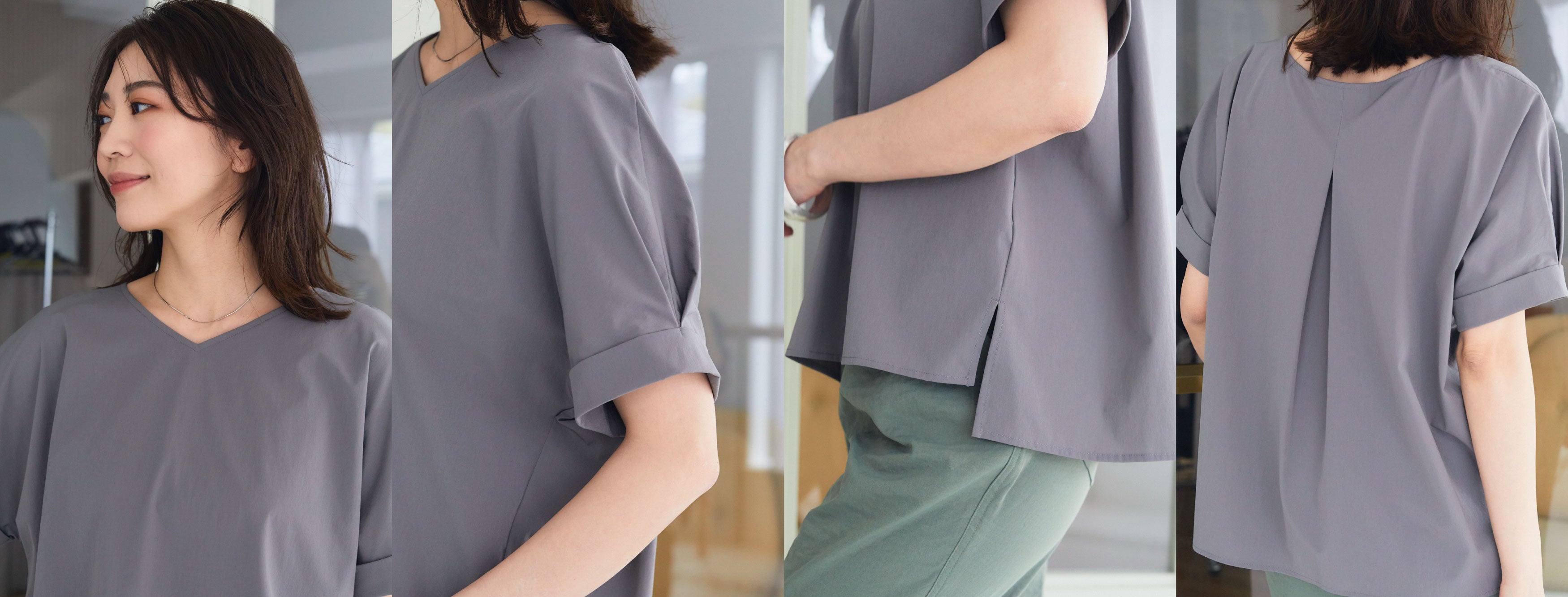Vネックで首元スッキリ、二の腕をカバーする丈のタック袖、裾のスリットとバックタックでふんわり体型カバーも実現。