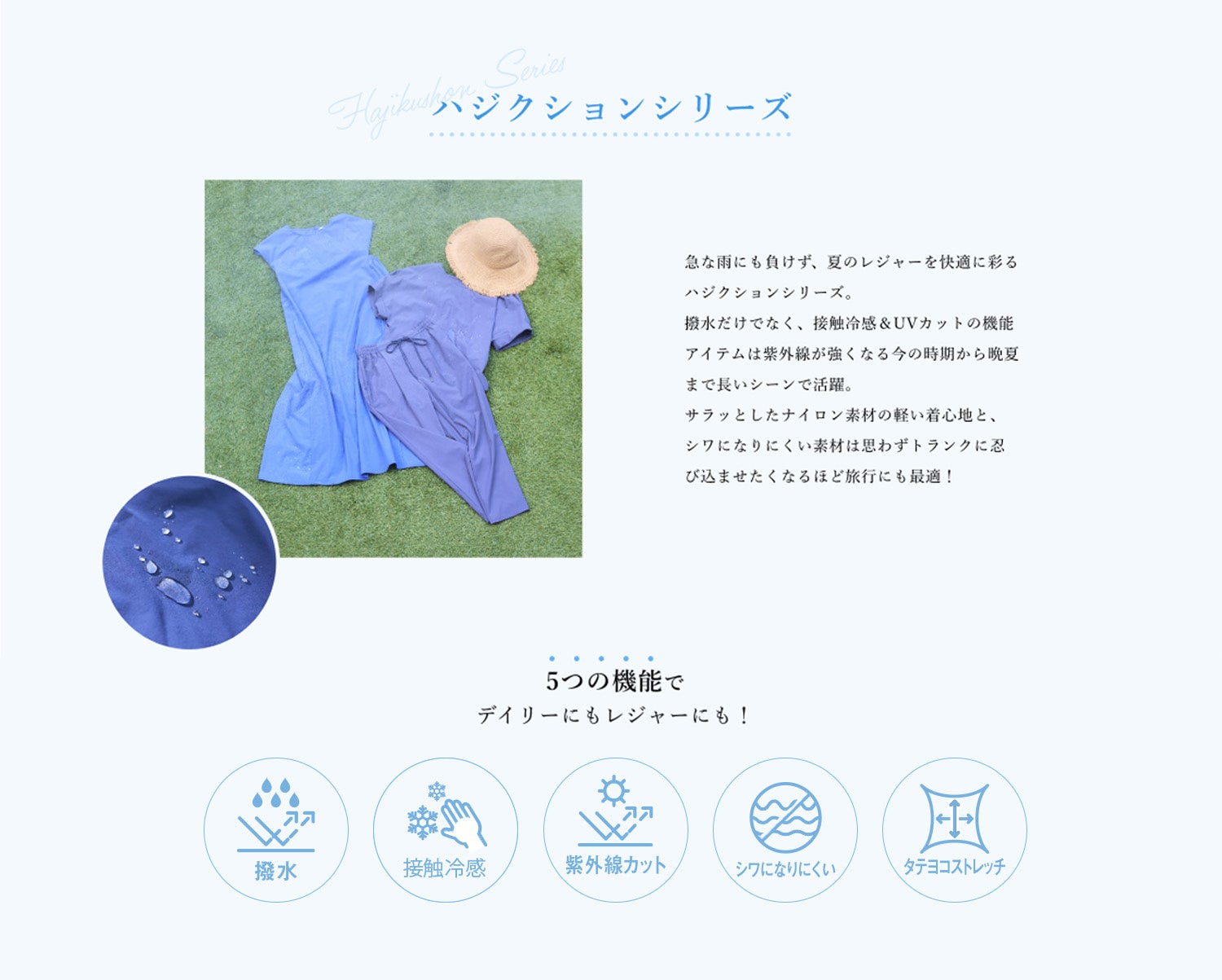 機能性を備えた「毎日着たいが詰まったデイリーウエア」をコンセプトに展開する「CROSS FUNCTION」。雨の日や汗ばむ暑い夏、水辺のレジャーシーンなど今から晩夏まで長く愛用できる、撥水を含めた5つの機能が備わった「ハジクション」シリーズを自社ECサイト「クロスマルシェ」にて販売開始いたしました。