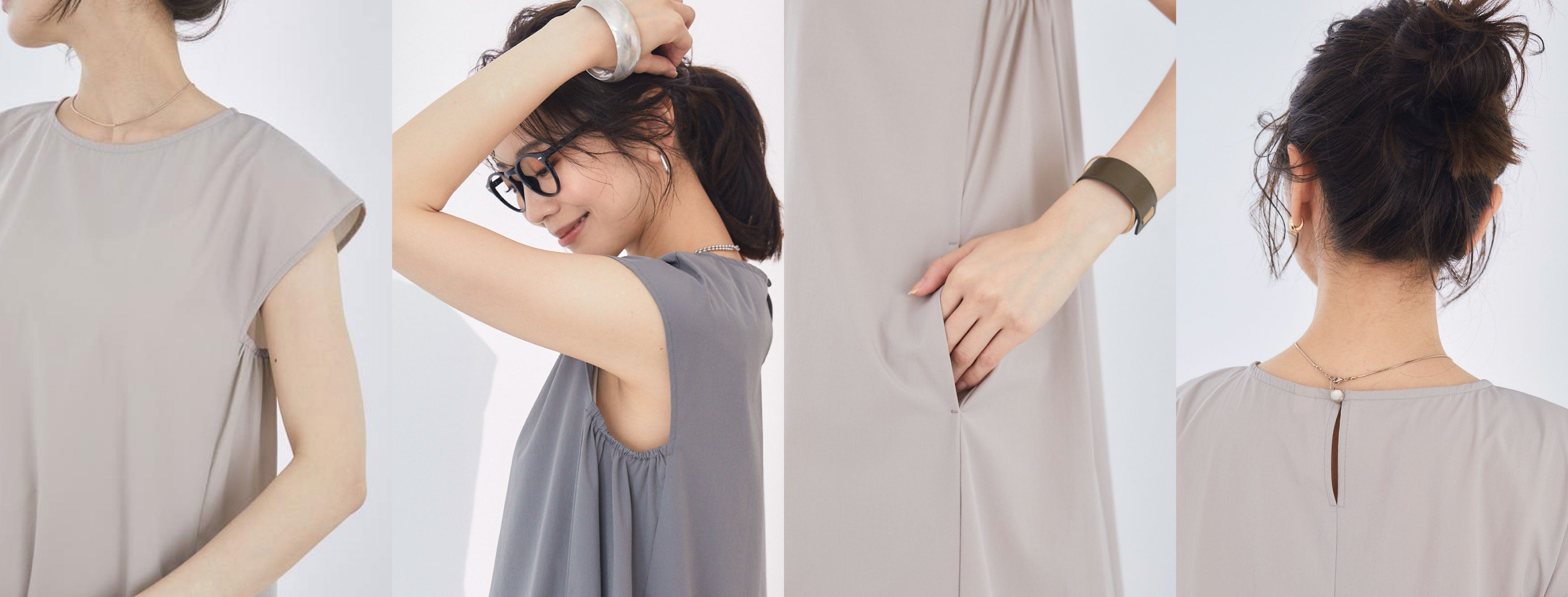 程よいフレンチスリーブ、アームホールの下部だけがゴム仕様、両ポケット付きで隠れたところに快適さ、後ろボタンがアクセントになりキレイ見え。