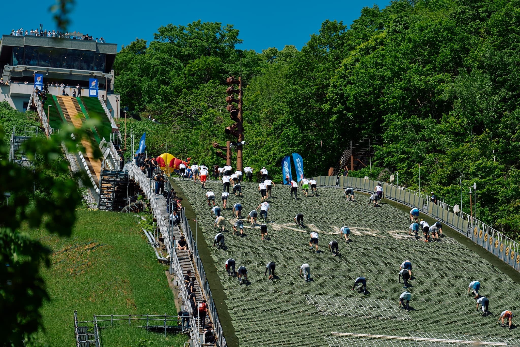 「Red Bull 400」は、男女個人・4×100m リレーの各種目に分かれ、長さ400mにわたるラージヒルのスキージャンプ台を一気に駆け上がり最高タイムを競うイベントです。最高斜度は富士山の山頂付近の傾斜(32度〜35度)を超える37度。立ったまま登ることがままならないほどの絶壁を誇ります。さらに、高低差は、札幌市のシンボル「さっぽろテレビ塔」に匹敵する約130mに及び、心拍数は平常時の約2倍〜3倍まで上がると言われています。