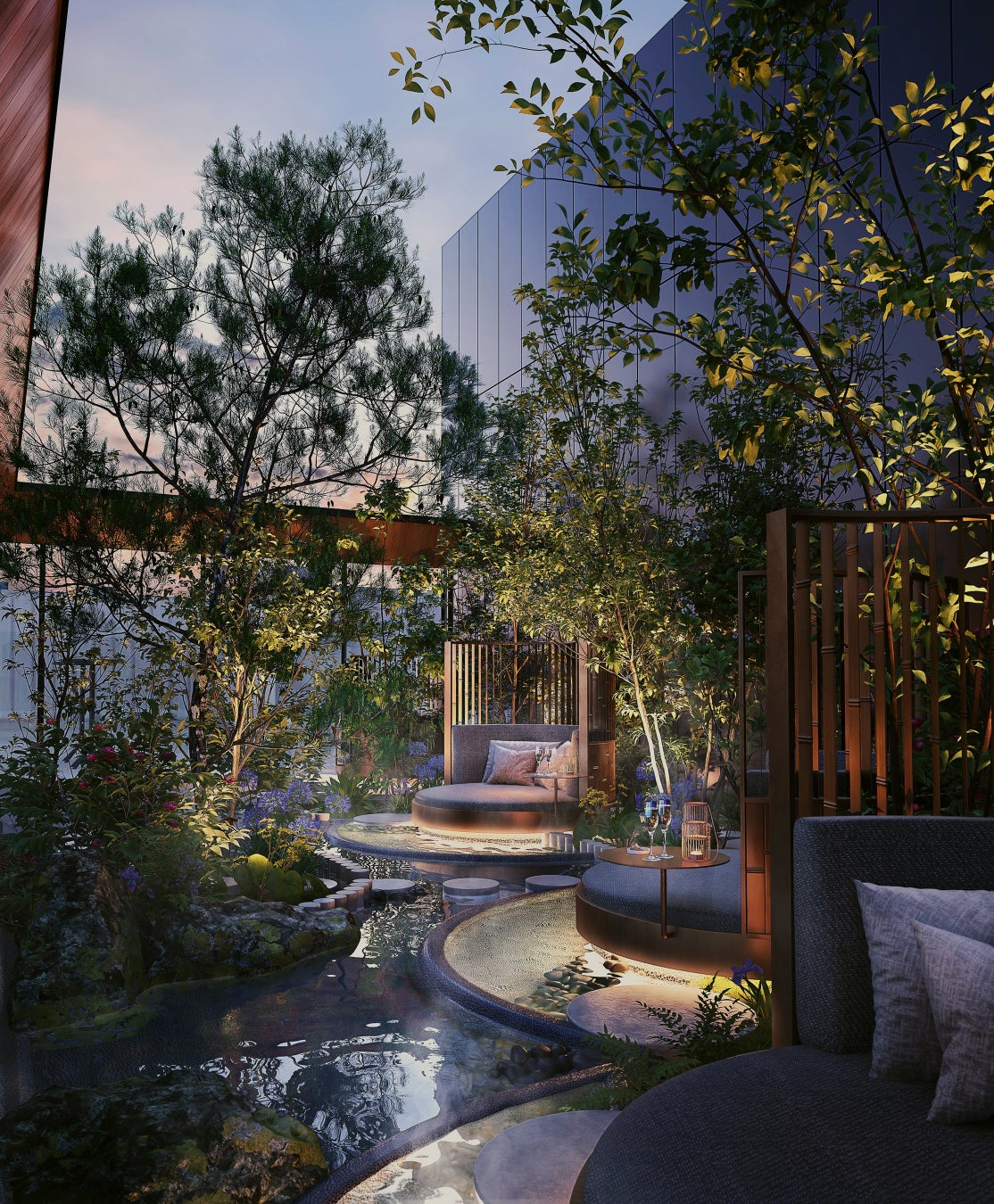 最上階のルーフトップラウンジ「ゆそら」は、屋上庭園の中に熱海から運んだ天然温泉の足湯を設えた特別な空間。木々に囲まれたプライバシーの高いデイベッドには個別に足湯を設け、銀座の空気と空を感じながら心地良い音楽と共にお寛ぎいただけます。視界がひらける一角からは、銀座の街並みや夜景がきらめきます。湯と空が溶け合う非日常空間をお愉しみください。