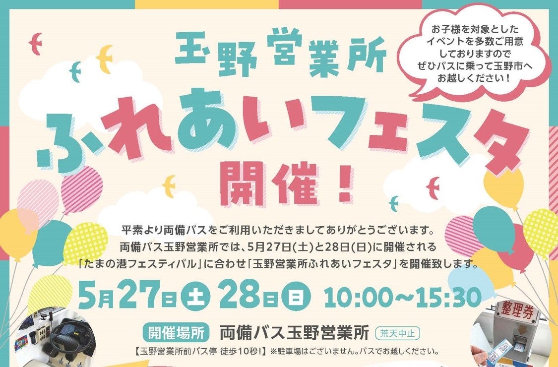 玉野営業所ふれあいフェスタは、同日玉野市宇野港周辺で開催される「第26回たまの・港フェスティバル」に合わせ、各地から玉野市にお越しになる方々に、会場近くのバスの営業所で、バスに親しみ楽しんでいただく機会をご提供しようと企画したものです。
