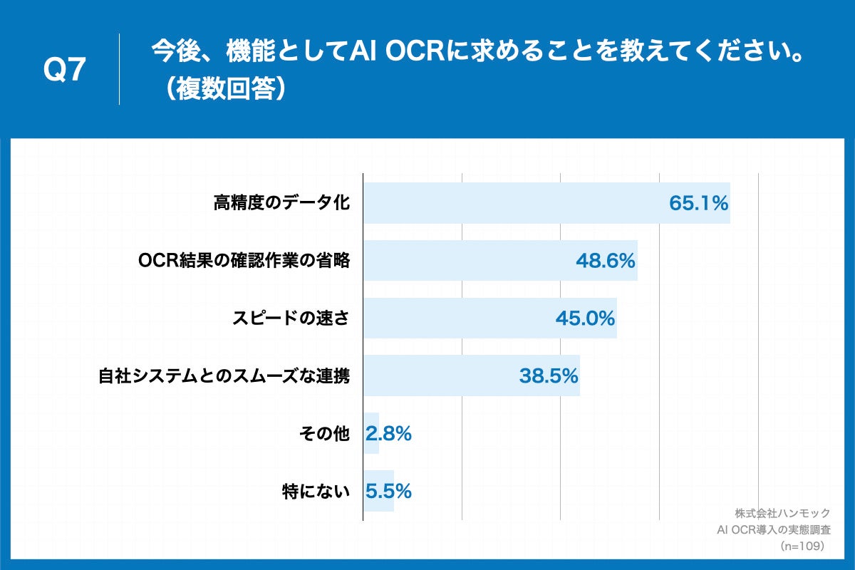 - 今後AI OCRに求める機能、「高精度のデータ化」(65.1%)や「OCR結果の確認作業の省略」(48.6%)