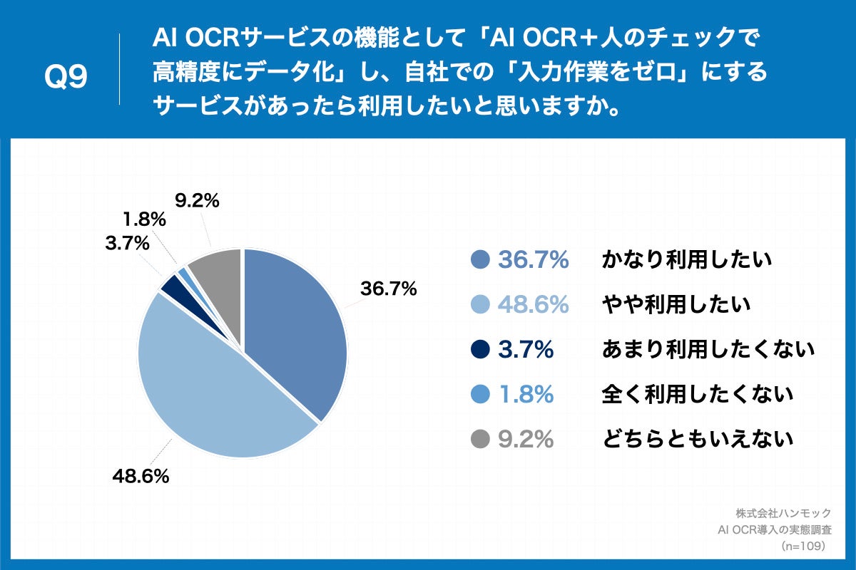 「Q9.AI OCRサービスの機能として「AI OCR+人のチェックで高精度にデータ化」し、自社での「入力作業をゼロ」にするサービスがあったら利用したいと思いますか。」(n=109)と質問したところ、「かなり利用したい」が36.7%、「やや利用したい」が48.6%という回答となりました。