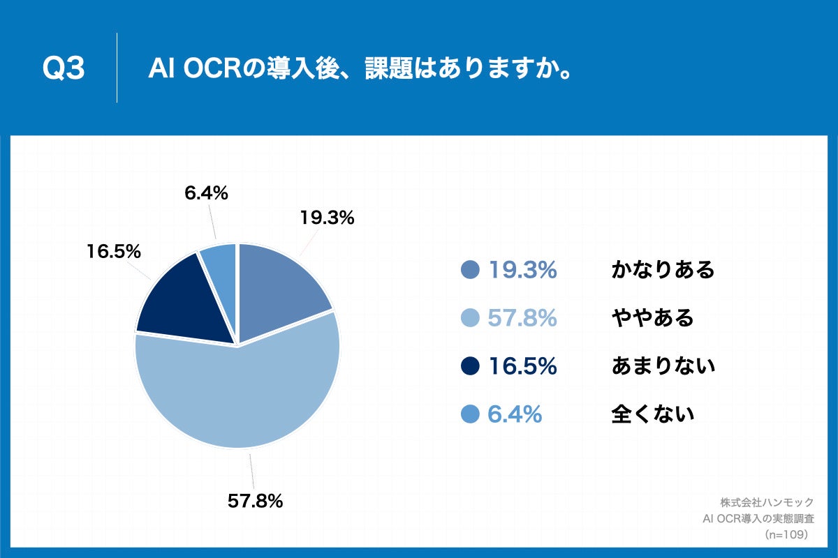 「Q3.AI OCRの導入後、課題はありますか。」(n=109)と質問したところ、「かなりある」が19.3%、「ややある」が57.8%という回答となりました。