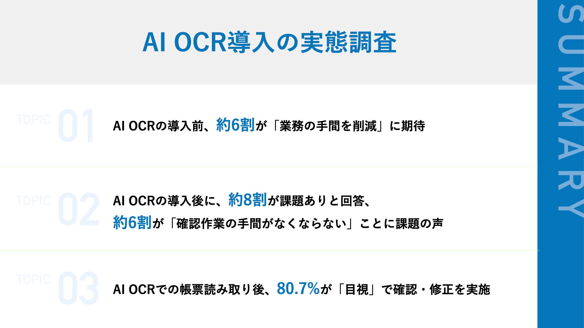 - AI OCRで帳票読み取り後、80.7%が「目視」で確認・修正を実施