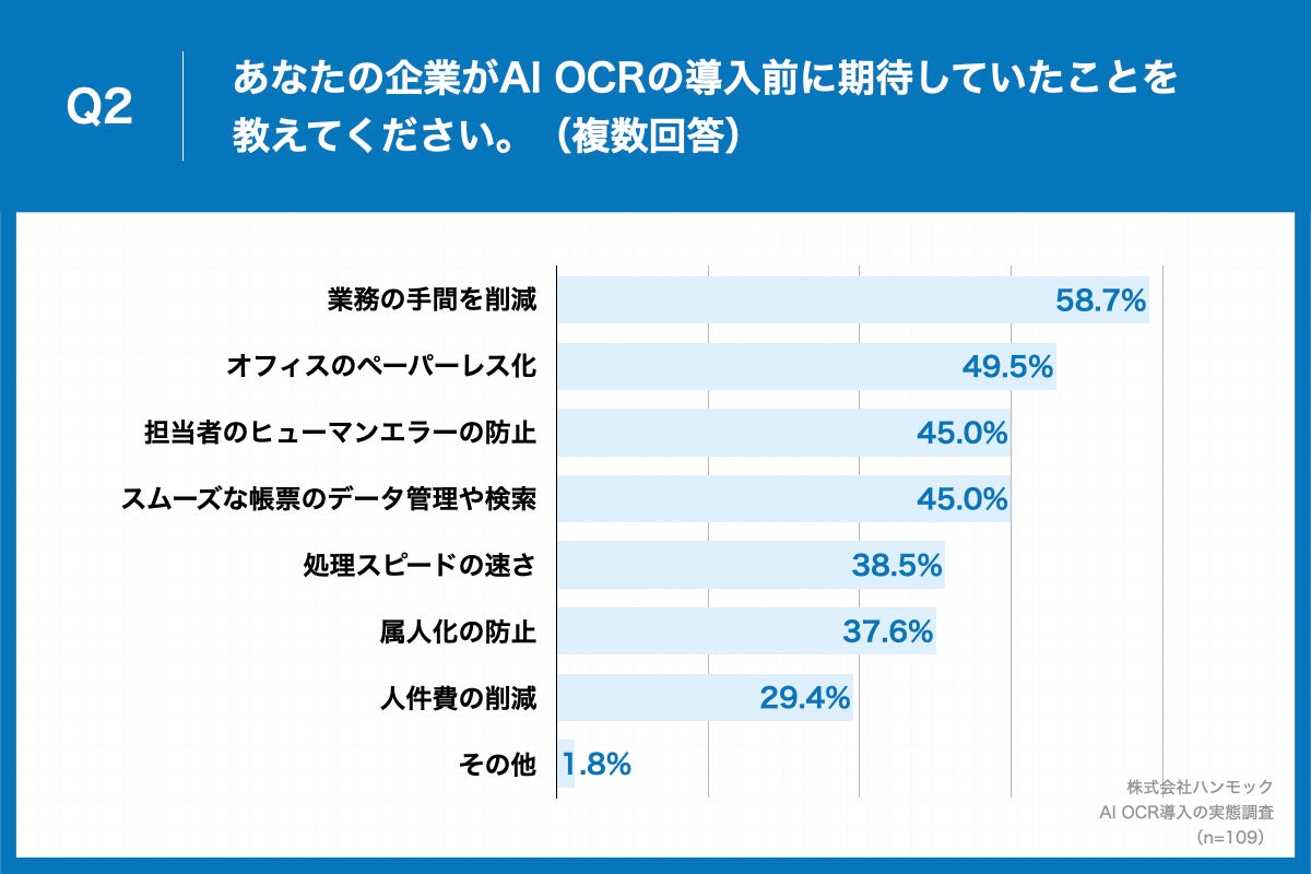 AI OCRで処理する1日の帳票数は、67.1%が「100枚以上」と回答。AI OCRの導入前に期待していたことを伺うと、「業務の手間を削減」(58.7%)や「オフィスのペーパーレス化」(49.5%)が挙がりました。