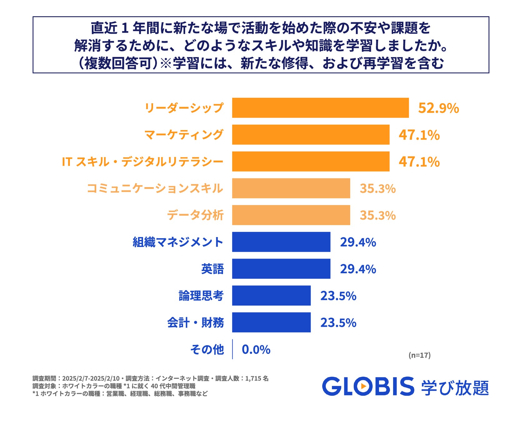 また、これらの不安や課題を自ら積極的に行動することで解消した人が多く、不安・課題を解消するための学習で多くの人が学んだ領域は「リーダーシップ」「マーケティング」「ITスキル・デジタルリテラシー」であることがわかりました。