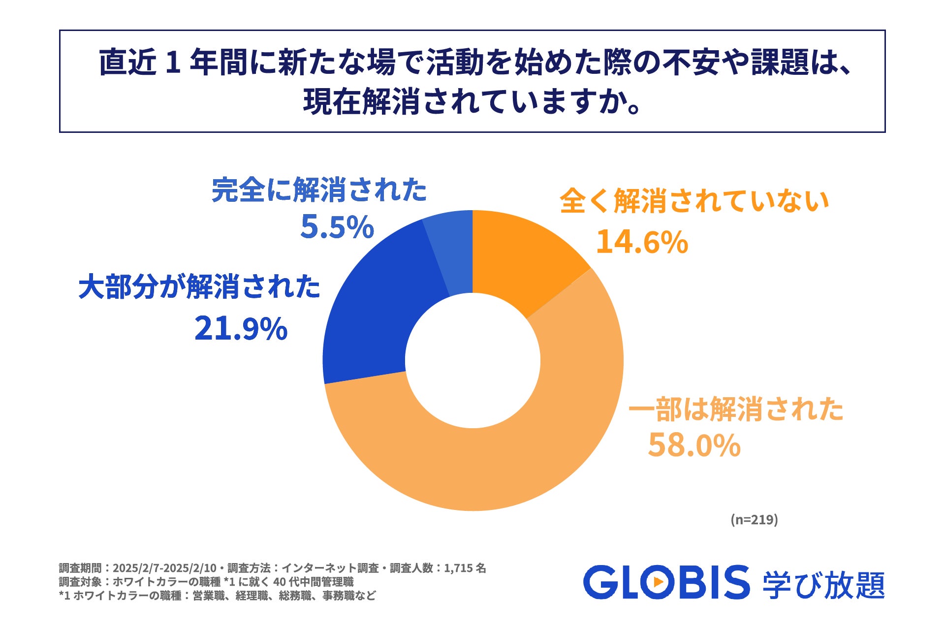 「GLOBIS 学び放題」は、異動・転職・新規プロジェクトへのアサインなどで新たな場に挑む40代の中間管理職を対象に、その不安や課題に関する実態調査を実施しました。
