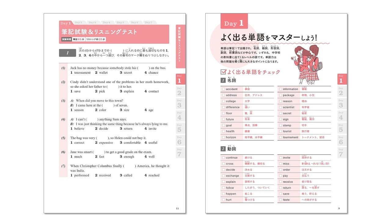 本書は、7日間で本番形式の予想問題を解くことで、試験直前の総仕上げができる問題集です。面接(スピーキングテスト)対策もできるので、これ1冊で試験の全体像を効率的に把握することができます。