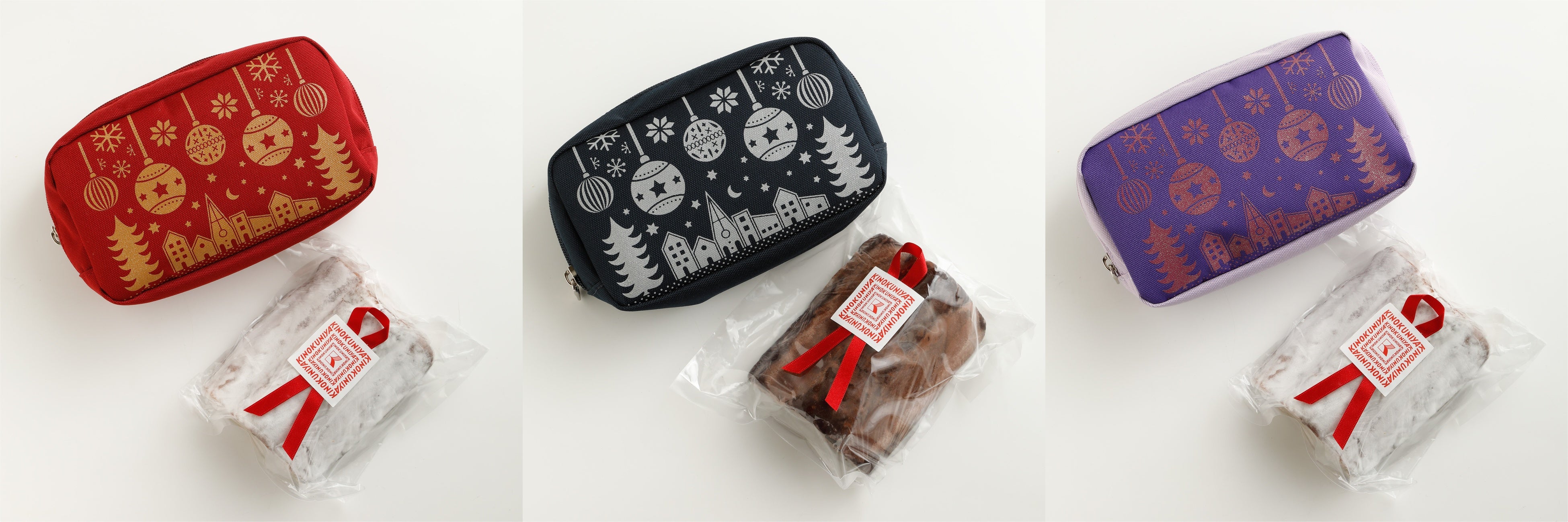 レッド、パープルのポーチには白い粉糖がかかった、マジパンシュトーレン入り。ネイビーのポーチにはチョコレート味のシュトーレンがそれぞれセットになっています。