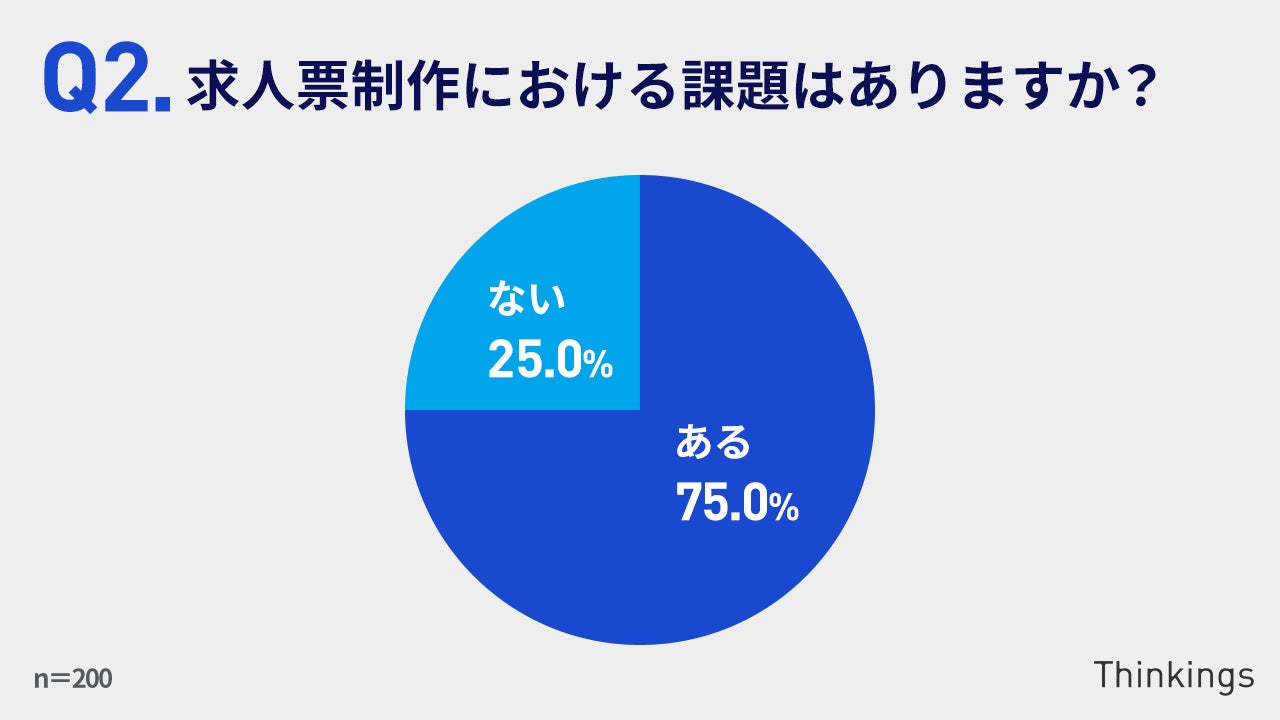 現在、求人票制作に課題を感じているか尋ねたところ、75.0%の人が「課題がある」と回答しました。「ない」と回答した人は25.0%で、多くの人事・採用担当者が、求人票制作に課題を感じていることがわかりました。