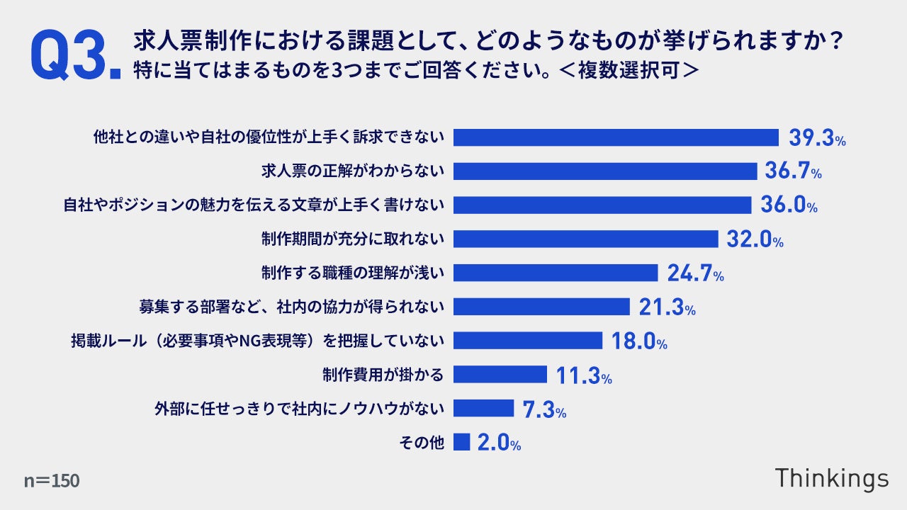 続いて、求人票制作の具体的な課題について尋ねたところ、「自社の優位性が上手く訴求できない」と回答した人が39.3%と最も多く、次いで「求人票としての正解がわからない」が36.7%、「自社やポジションの魅力を伝える文章が上手く書けない」が36.0%と続きました。