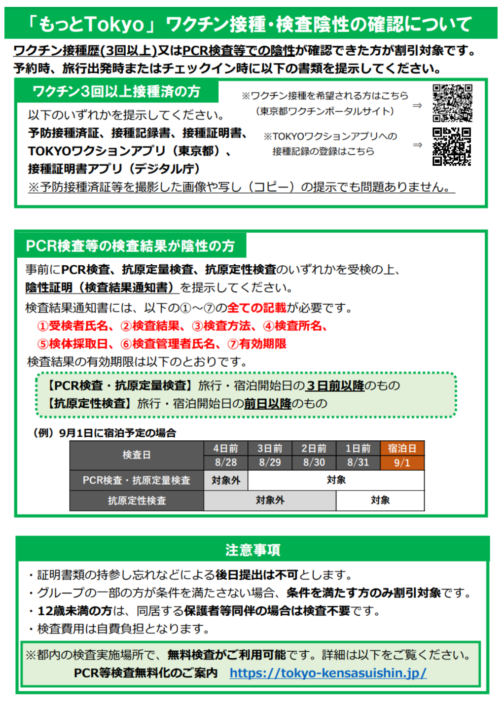 ・接種済証またはPCR検査等結果通知書(撮影画像、コピー、電子的な証明書でも可)の確認は、同行者も含めて旅行者全員について実施しますので、チェックイン時(旅行会社の場合は予約証明書等お渡しの来店時)にご提示ください。提示のない場合は割引支援を受けることができません。