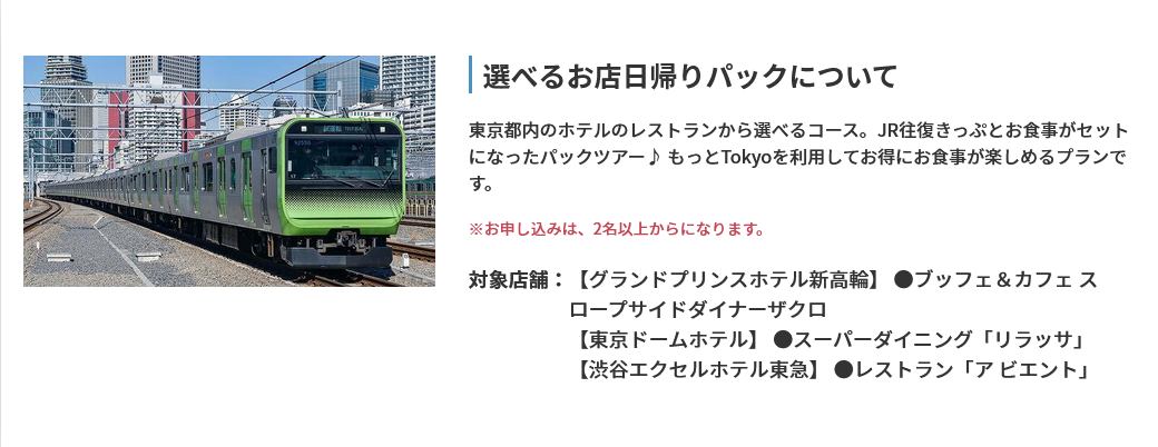 東京都内のホテルのレストランから選べるコース。JR往復きっぷとお食事がセットになったパックツアー♪ もっとTokyoを利用してお得にお食事が楽しめるプランです。