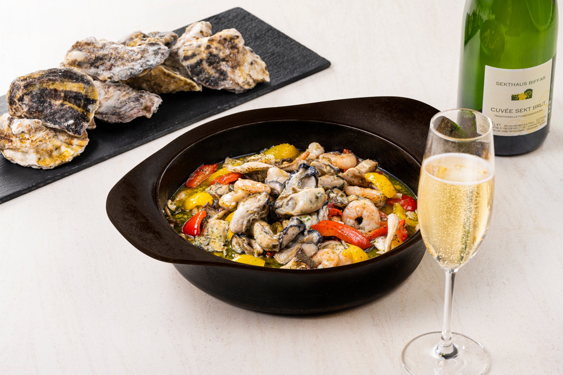 牡蠣をガーリックオイルで香ばしく煮込んだ一皿。濃厚な旨みと香りが口いっぱいに広がります。