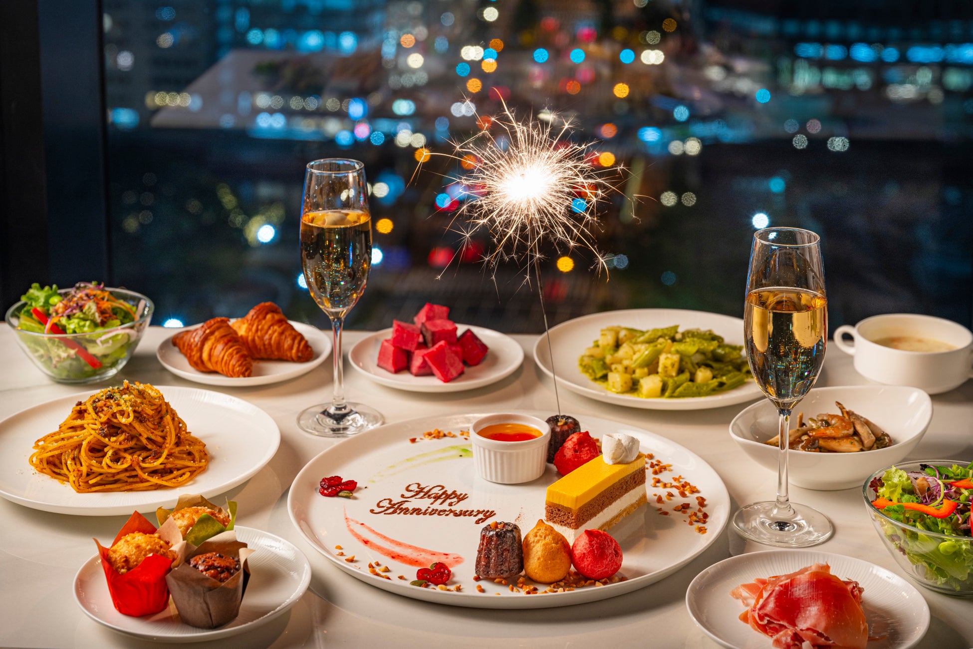 さらに、大切な方との特別な日をより非日常感溢れる一日にしていただくため、オリジナルビュッフェに加えて、こだわりのワインを含めた約25種類のプレミアムドリンク飲み放題と記念日用オリジナルデザートプレートを大阪市内(御堂筋)の絶景を眺めながらお愉しみいただける「天空のアニバーサリープラン」もご用意しております。また、2025年12月1日(月)~25日(木)限定で、クリスマスメッセージ付きのプレートをご提供します。
