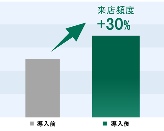 「LOGOS SHOP」では、「楽天チェック」を導入後、平均来店頻度が30%以上向上し、購買頻度も20%以上向上しました。これはチラシなどの一般的な来店販促に比べ非常に高い数値となっています。(注)