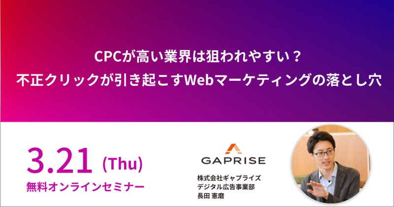 デジタルビジネス支援を行う、海外SaaS商社の株式会社ギャプライズ(本社:東京都千代田区、代表取締役 CEO:甲斐 亮之、以下「当社」)は、3月21日(木)13時より、「CPCが高い業界は狙われやすい?不正クリックが引き起こすWebマーケティングの落とし穴」と題しましたオンラインセミナーを開催する事をお知らせいたします。