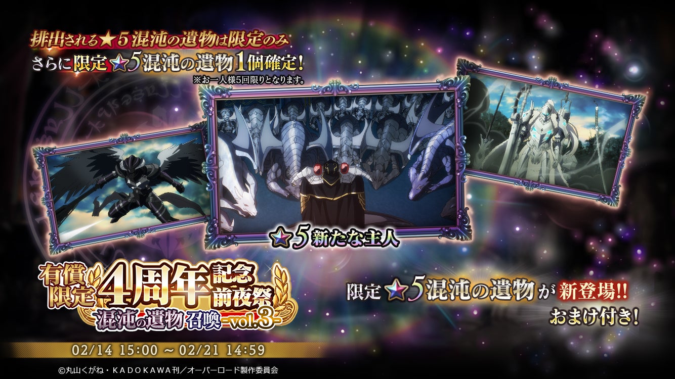 2/14より『4周年記念前夜祭キャンペーン-第3弾-』を開催!これまでに登場した限定キャラクターをはじめ、限定の★5混沌の遺物を集めた召喚のvol.3を実施!さらに、お得なパックの販売や前夜祭ログインボーナスなども実施いたします!イベントはご好評いただいている『罅裂領域』を開催!