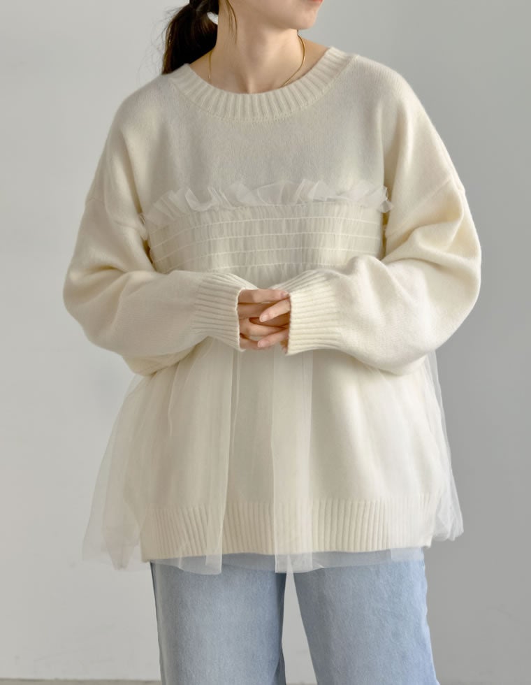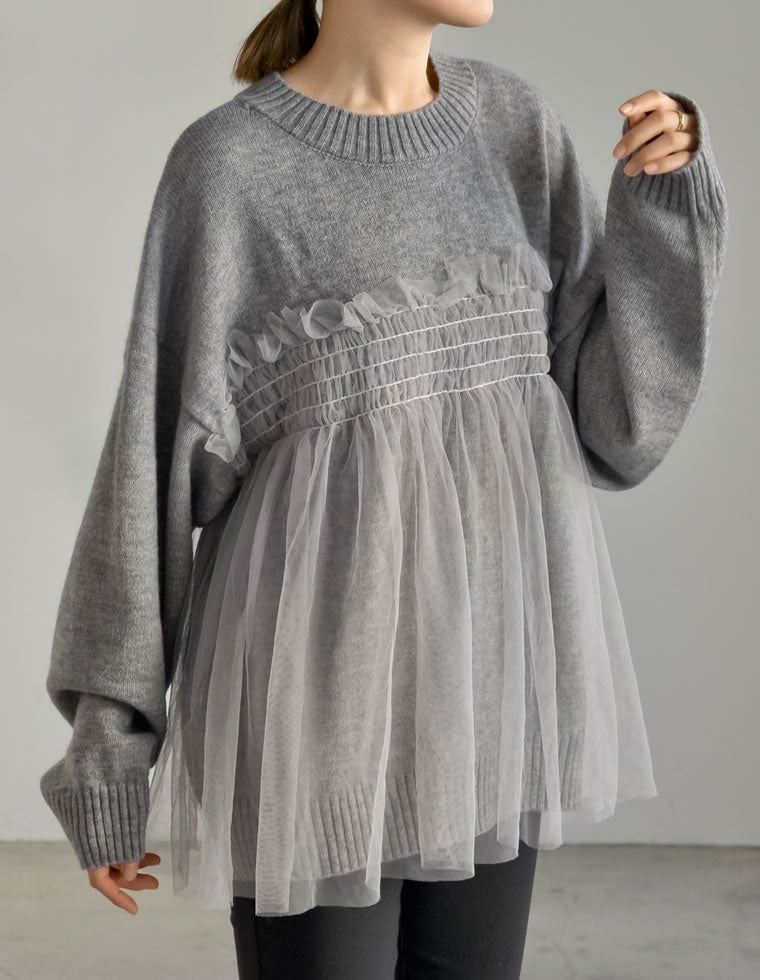 ふんわりとした柔らかい着心地に仕上げたチュールドッキングニットプルオーバー。