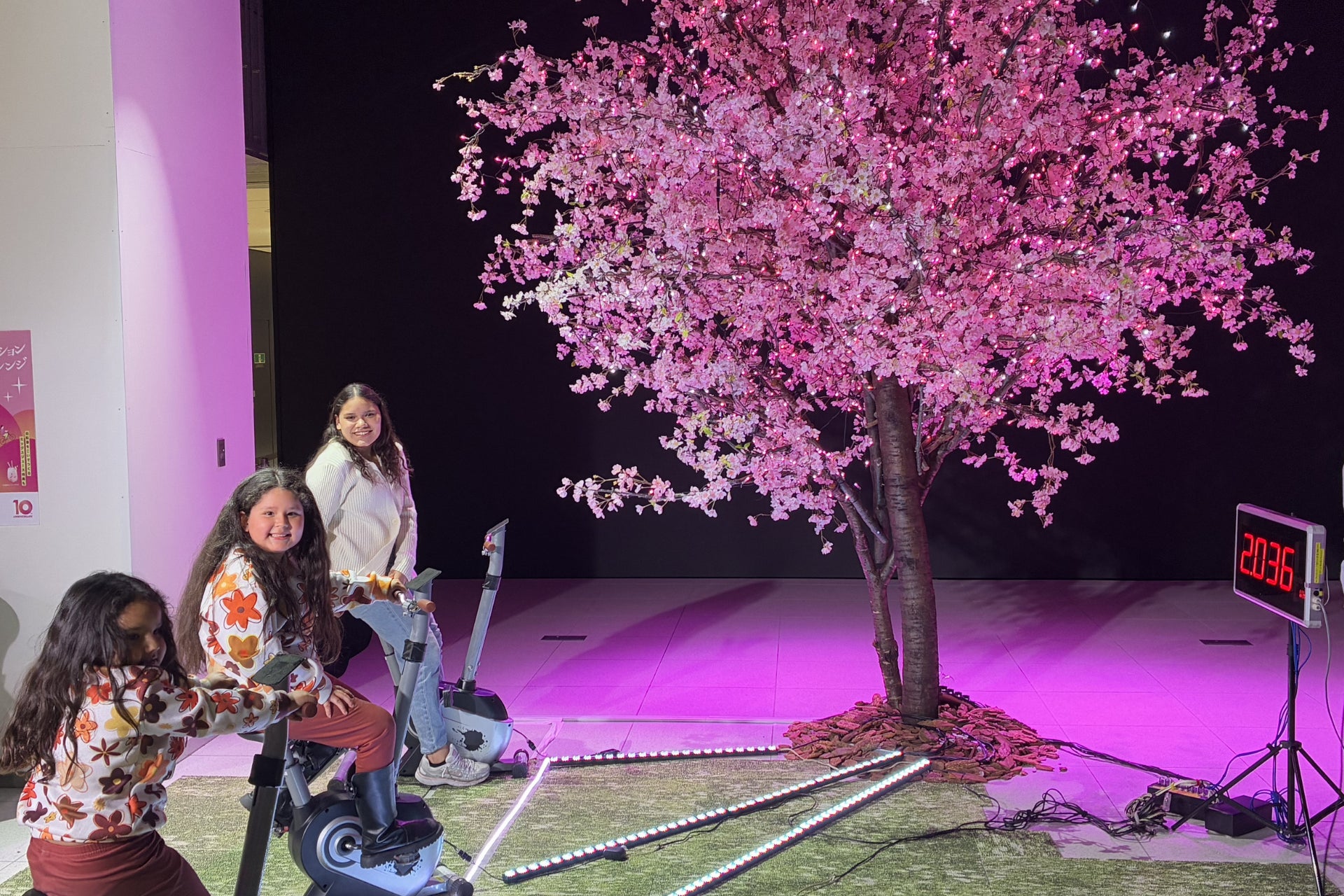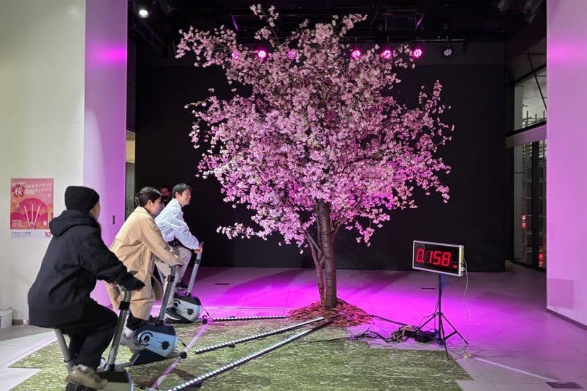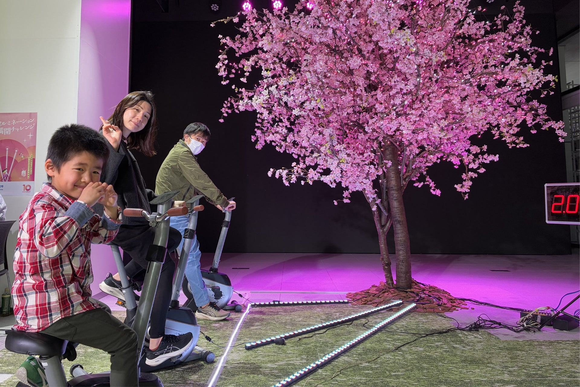 そこで、これまでの感謝を伝えるとともに、電気をより身近なものとして体感していただきたいという想いから、本体験型イベントを開催しました。特に受験や新生活など大きな挑戦を控えた方々へのエールを込め、一足早い春を感じながら楽しんでいただくべく、自転車をこいで高さ4mの桜のイルミネーションを点灯する体験を提供しました。
