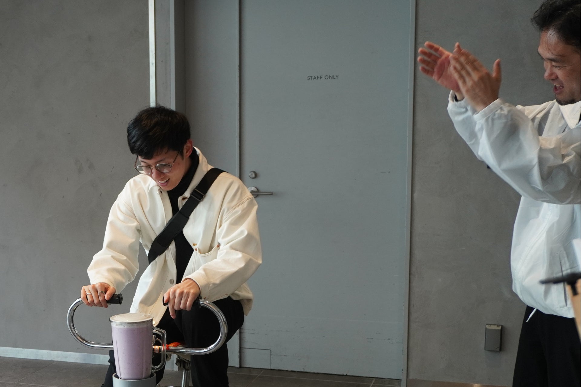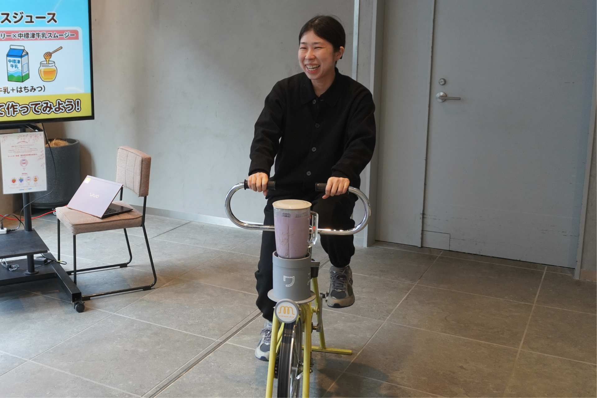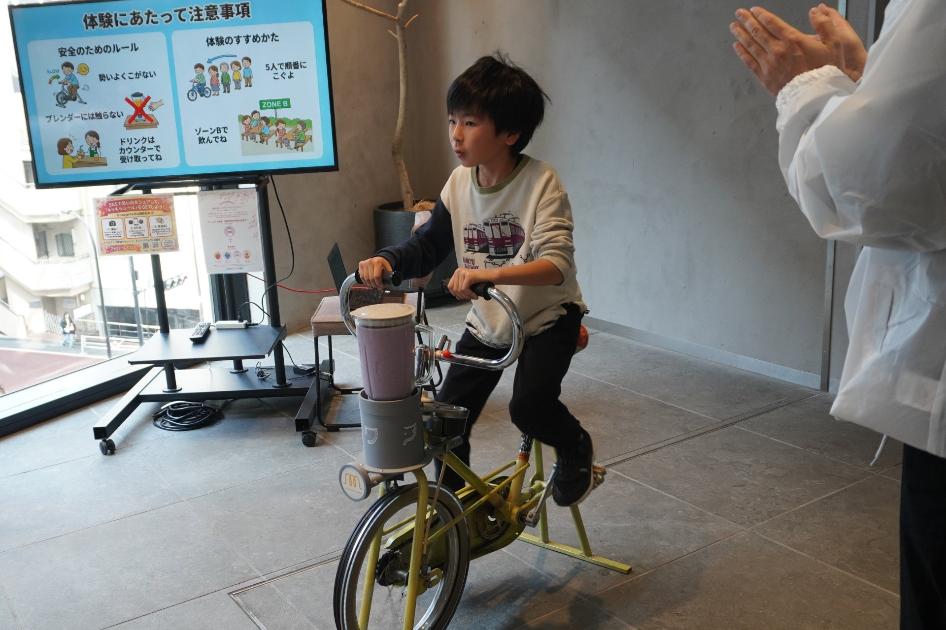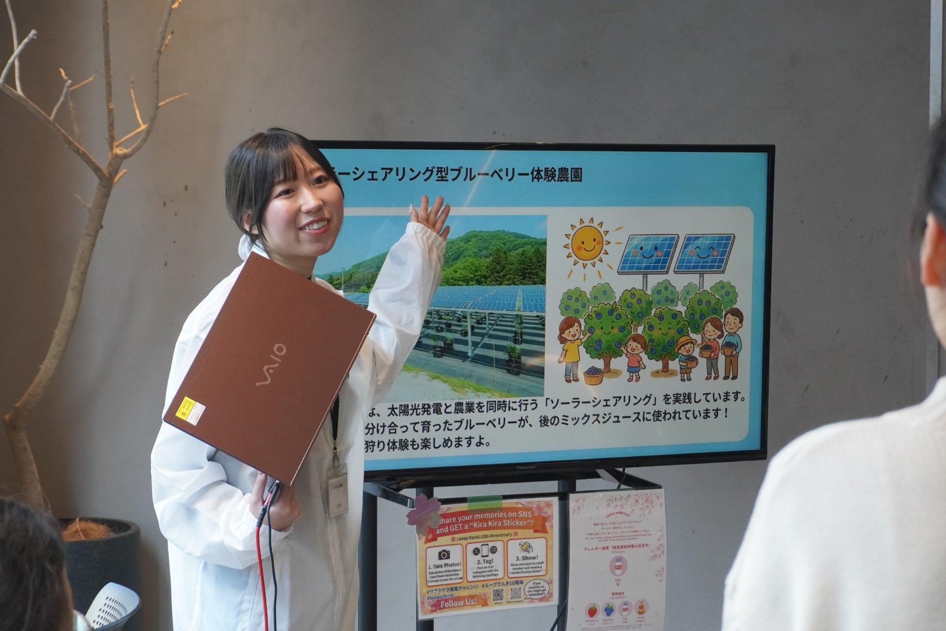 サクラサク発電チャレンジの特典として、自ら自転車をこいで作る特製ミックスジュースを提供しました。Looopの太陽光発電所があり、小学校での発電教室を開催する北海道の中標津町から取り寄せた牛乳、那須にあるLooopの宿泊施設にちなんだ栃木産のいちご、太陽光パネルの下で育まれた「ソーラーシェアリング」産のブルーベリーを使用。両日とも予定していた150杯が半日で終了する反響となりました。