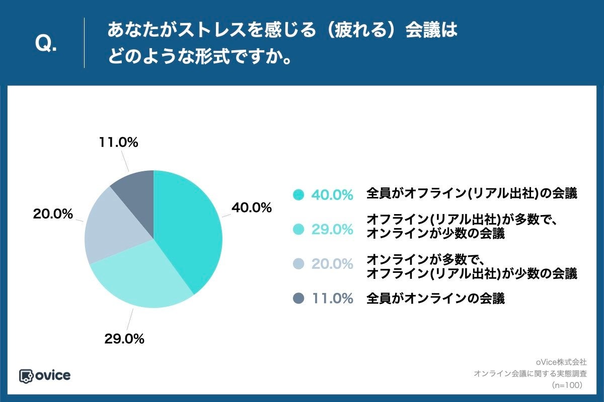 「Q.あなたがストレスを感じる(疲れる)会議はどのような形式ですか。 」(n=100)と質問したところ、「全員がオフライン(リアル出社)の会議」が40.0%、「オフライン(リアル出社)が多数で、オンラインが少数の会議」が29.0%という回答となりました。