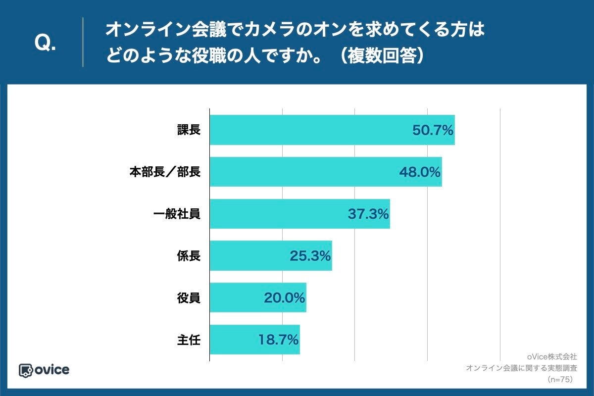 上記の設問で、「何度もある」「数回程度ある」「一度だけある」と回答した方に、「Q.オンライン会議でカメラのオンを求めてくる方はどのような役職の人ですか。(複数回答)」(n=75)と質問したところ、「課長」が50.7%、「本部長/部長」が48.0%という回答が得られました。回答者である20~30代の直属の上司が現場で部下を指導している様子が想定されます。