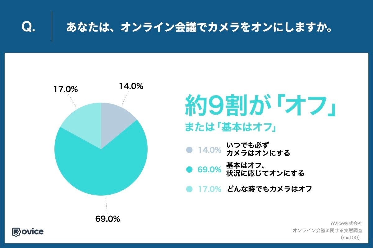 「Q.あなたは、オンライン会議でカメラをオンにしますか。」(n=100)と質問したところ、「基本はオフ、状況に応じてオンにする」が69.0%、「どんな時でもカメラはオフ」が17.0%という回答となり、約9割の方が、カメラはオフで参加していることが分かりました。