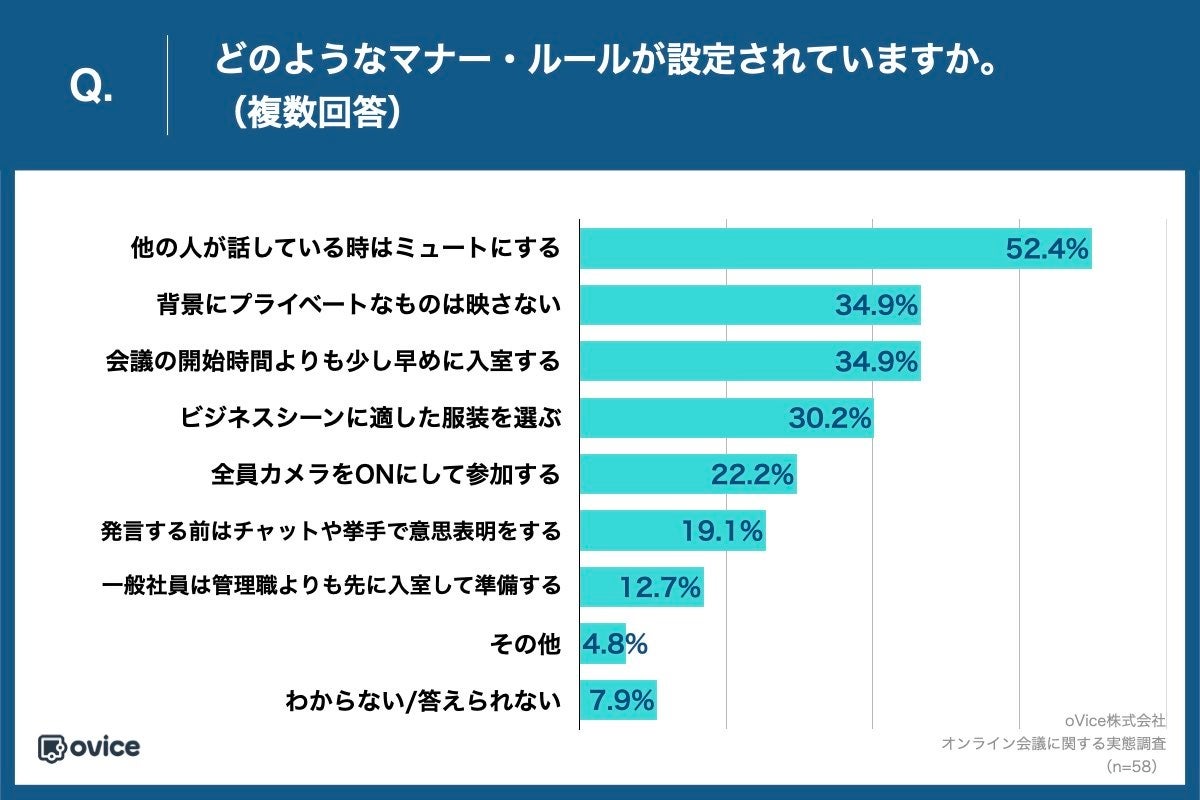 上記の設問で「はい」または「暗黙のルールがある」と回答した方に、「Q.どのようなマナー・ルールが設定されていますか。(複数回答)」(n=63)と質問したところ、「他の人が話している時はミュートにする」が52.4%と最多の回答となったのに比べ、「全員がカメラをONにして参加する」は半数以下の22.2%という回答になりました。