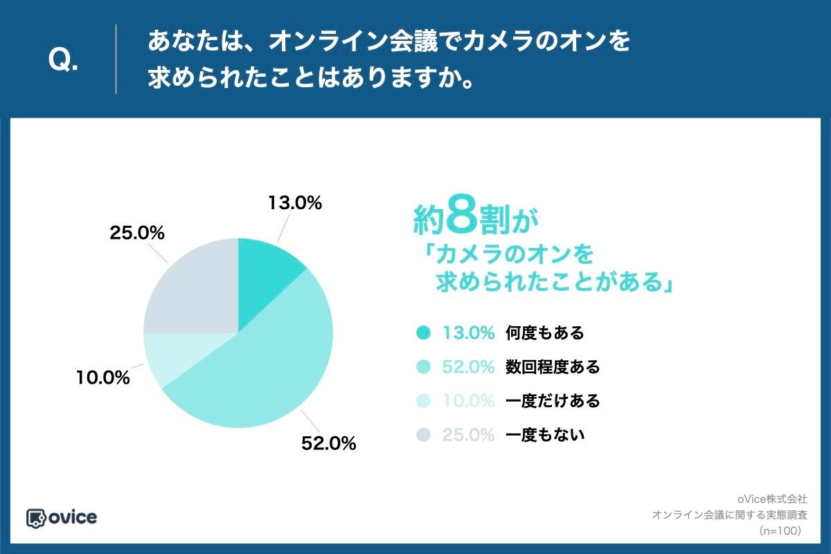 「Q.あなたは、オンライン会議でカメラのオンを求められたことはありますか。」(n=100)と質問したところ、「何度もある」が13.0%、「数回程度ある」が52.0%、「一度だけある」が10.0%という回答になり、約8割がこれまでに「カメラのオンを求められことがある」ということがわかりました。