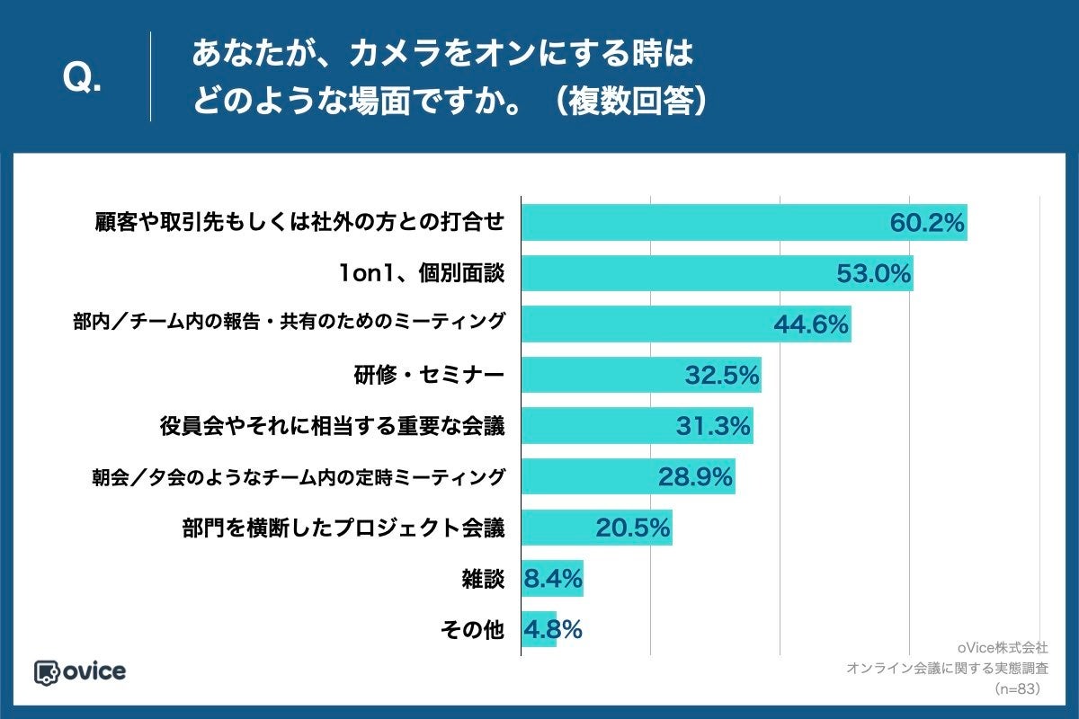 上記の設問で「いつでも必ずカメラはオンにする」「基本はオフ、状況に応じてオンにする」と回答した方に、「Q.あなたが、カメラをオンにする時はどのような場面ですか。(複数回答)」(n=83)と質問したところ、最多の「顧客や取引先もしくは社外の方との打合せ」が60.2%、最少の「雑談」が8.4%という回答になりました。最多と最少で7倍を超える開きがあり、TPO(時間・場所・状況)に応じてカメラをオン/オフを使い分けている様子がみられました。