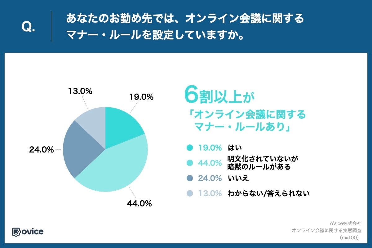 「Q.あなたのお勤め先では、オンライン会議に関するマナー・ルールを設定していますか。」(n=100)と質問したところ、「はい」が19.0%、「明文化されていないが暗黙のルールがある」が44.0%という回答となりました。