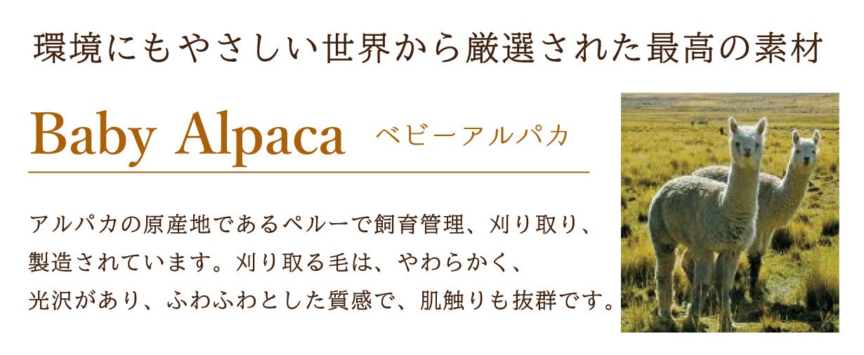 ベビーアルパカは通常のアルパカよりも繊維が非常に細く、この細さが、軽く、柔らかく、なめらかな生地を生み出します。アルパカ毛は全て、アルパカ産地の本場ペルーで採取された素材だけを使用しており、南米ペルーの南北にはしるアンデス山脈ではマイナス20度からプラス30度という厳しく寒い高地。