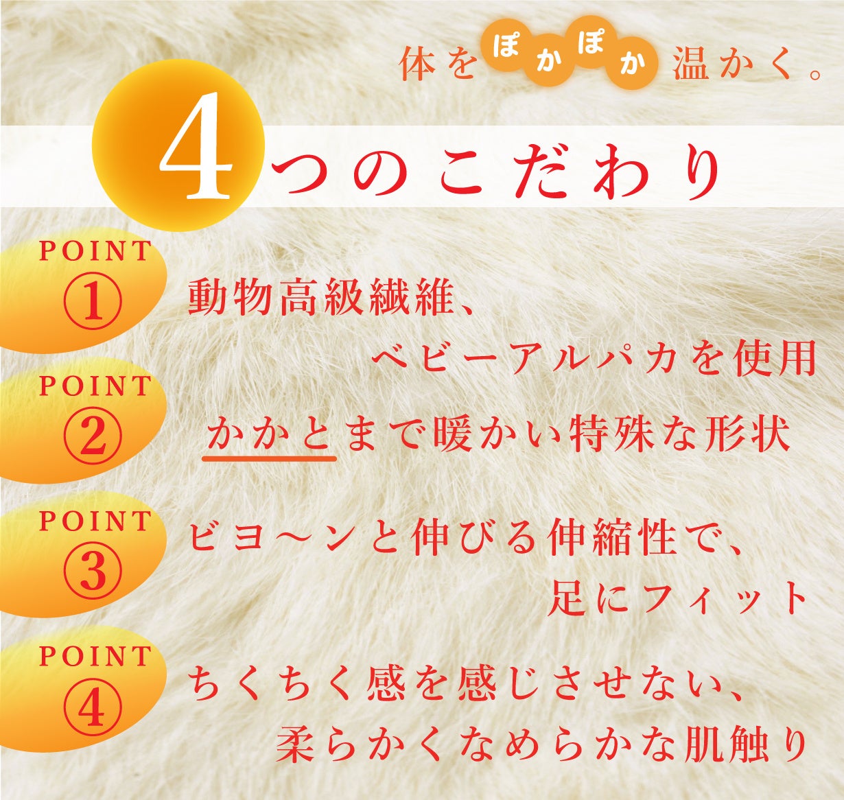 ・タイトル:かかとまでぽっかぽか!足にフィットして温める。ベビーアルパカレッグウォーマー