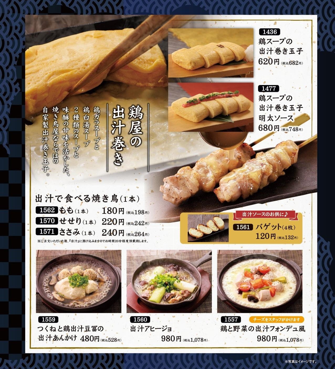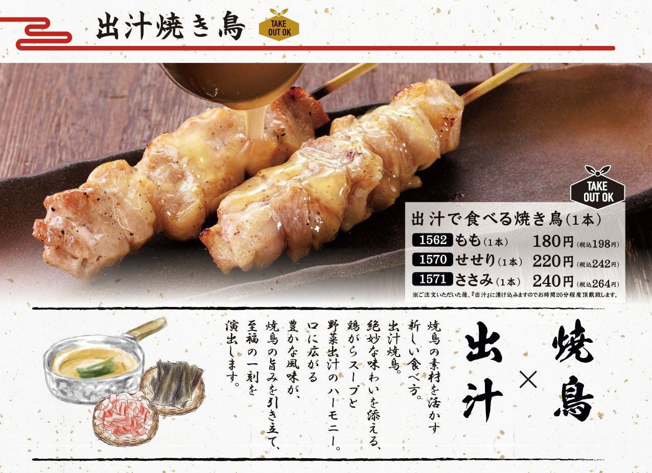 焼鳥の素材を活かす新しい食べ方。《出汁焼鳥》。絶妙な味わいを添える、鶏がらスープと野菜出汁のハーモニー。口に広がる豊かな風味が焼鳥の旨みを引き立て、至福の一刻を演出します。