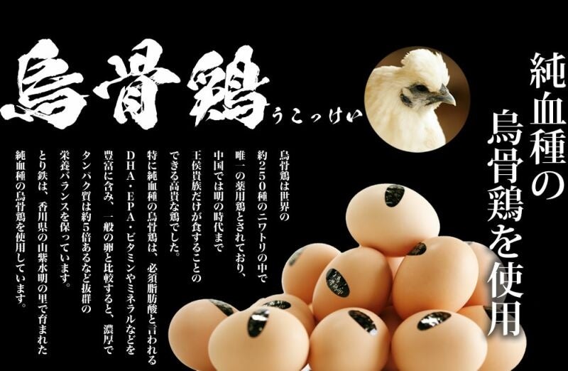 烏骨鶏は世界の約250種のニワトリの中で唯一の薬用鶏とされており、中国では明の時代まで王侯貴族が食することのできる高貴な鶏でした。特に純血種の烏骨鶏は、必須脂肪酸と言われるDHA・EPA・ビタミンやミネラルなどを豊富に含み、一般の卵と比較すると、濃厚でタンパク質は約5倍あるなど抜群の栄養バランスを保っております。とり鉄は、香川県の山紫水明の里で育まれた純血種の烏骨鶏を使用しています。