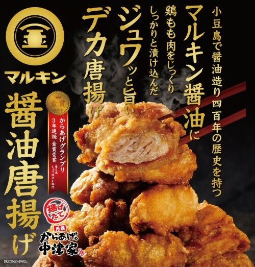 小豆島で醤油造り 四百年の歴史を持つマルキン醤油に鶏もも肉をじっくりしっかりと漬け込んだジュワッと旨いデカ唐揚げです。
