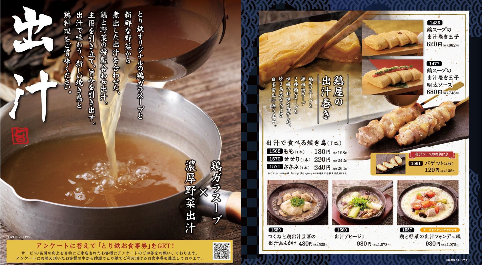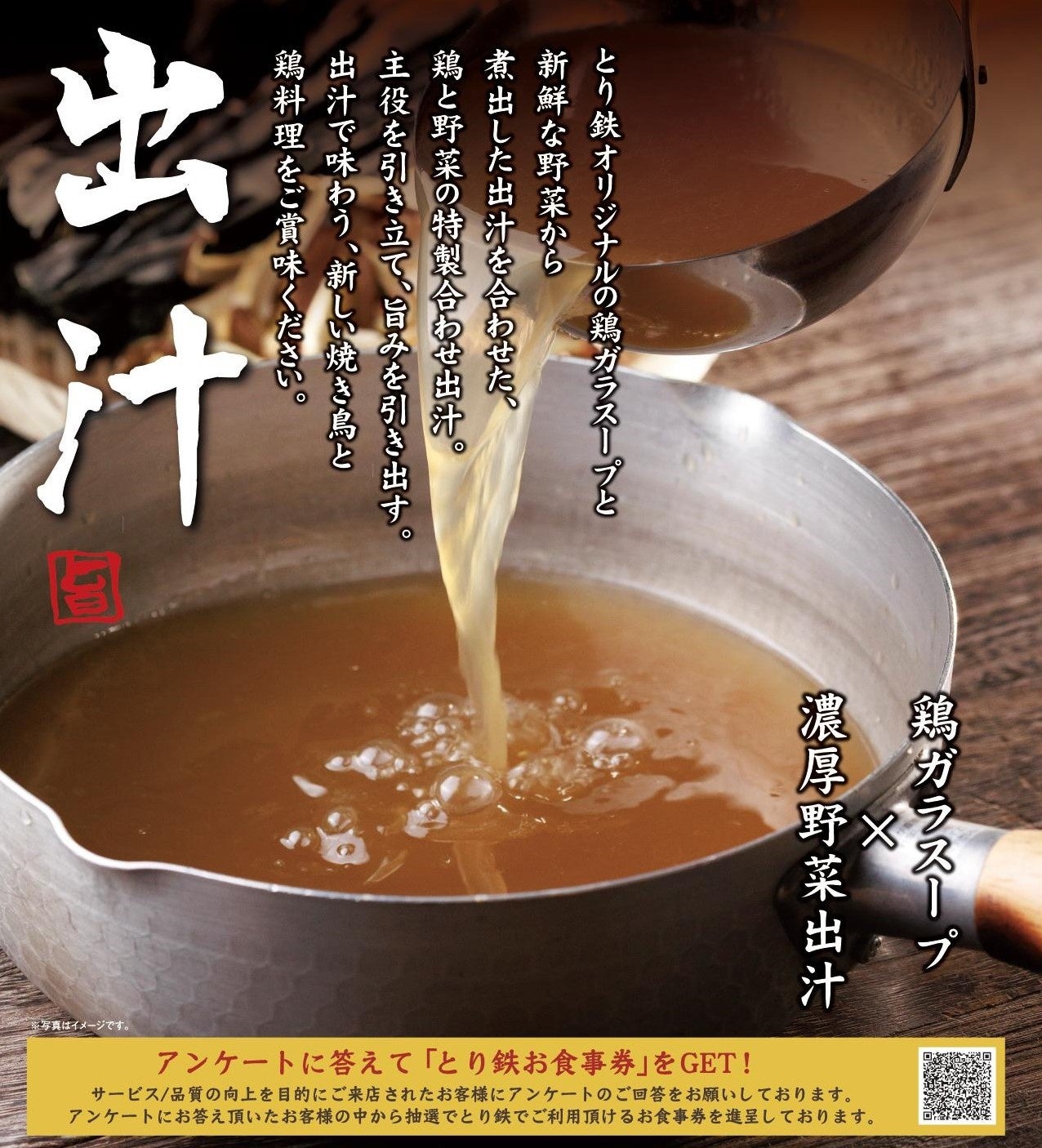 とり鉄オリジナルの鶏がらスープと新鮮な野菜から煮出した出汁を合わせた、特製合わせ出汁。