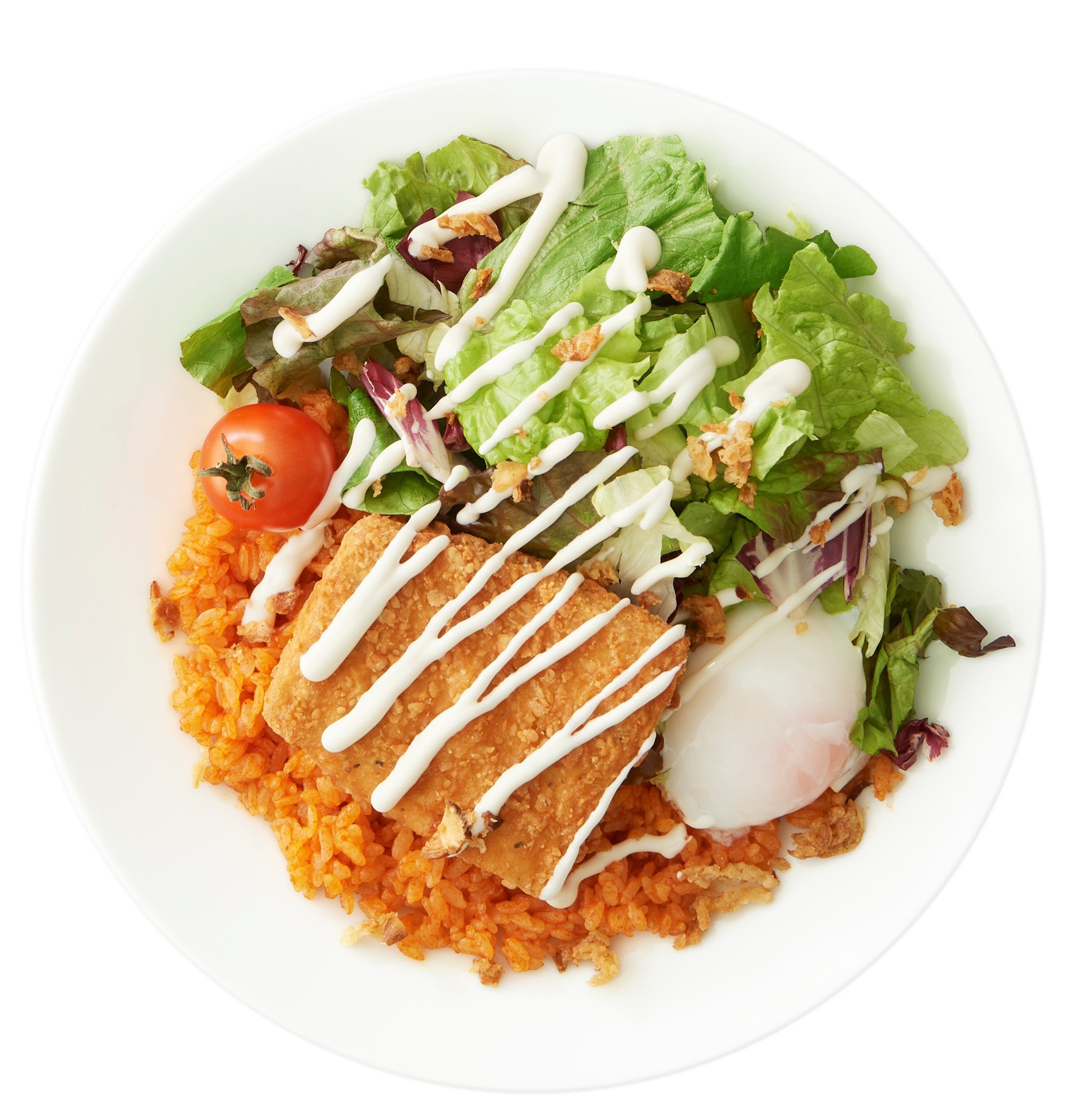 ケチャップライスにプラントベースのフライドチキン、サラダ、トマト、温泉卵をのせました。ヘルシーなのに、満足感を味わえるプレートです。
