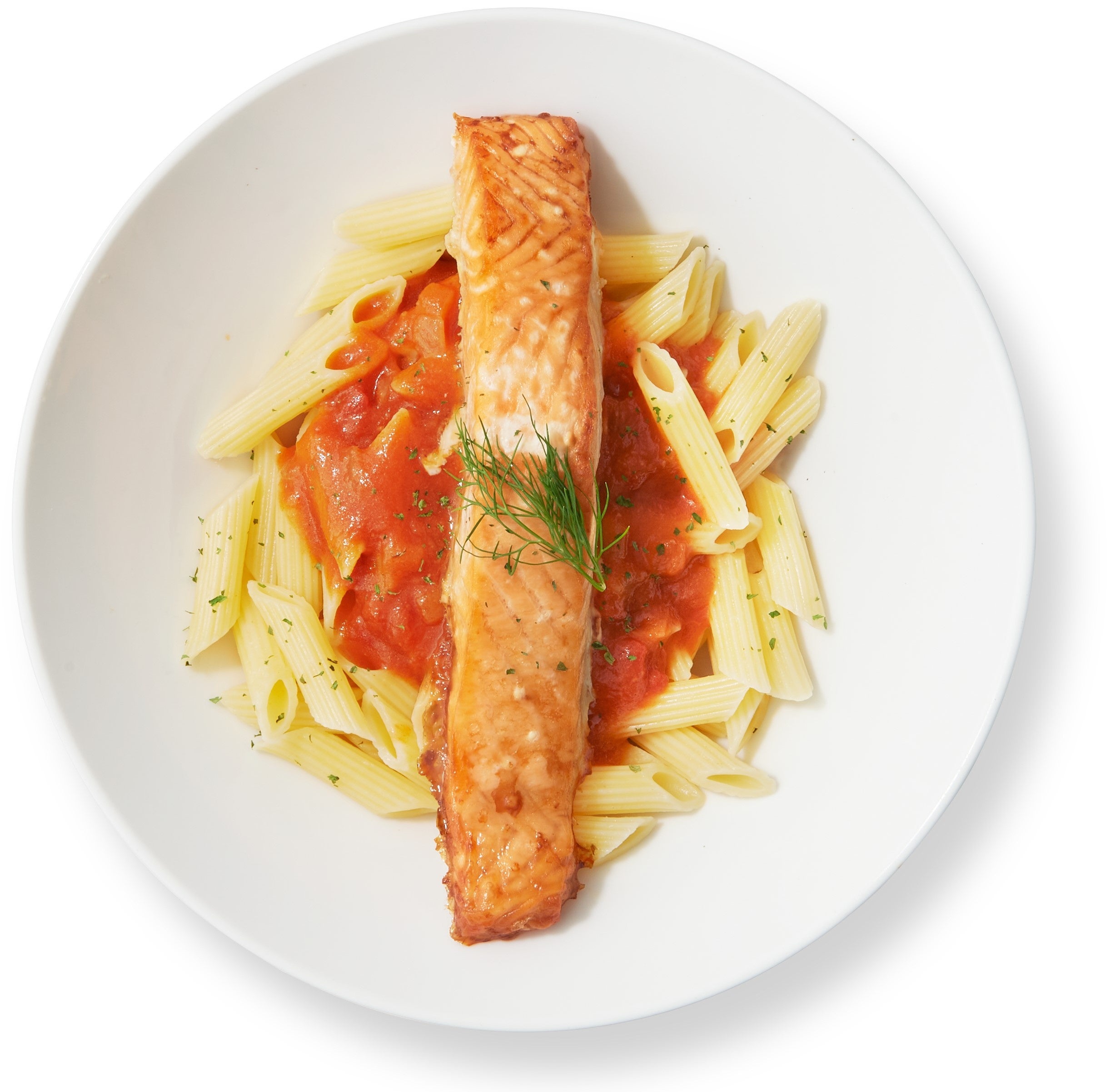 ペンネの上に脂ののった厚めのサーモンフィレをのせたボリューム満点の一品です。トマトソースをからめてどうぞ。