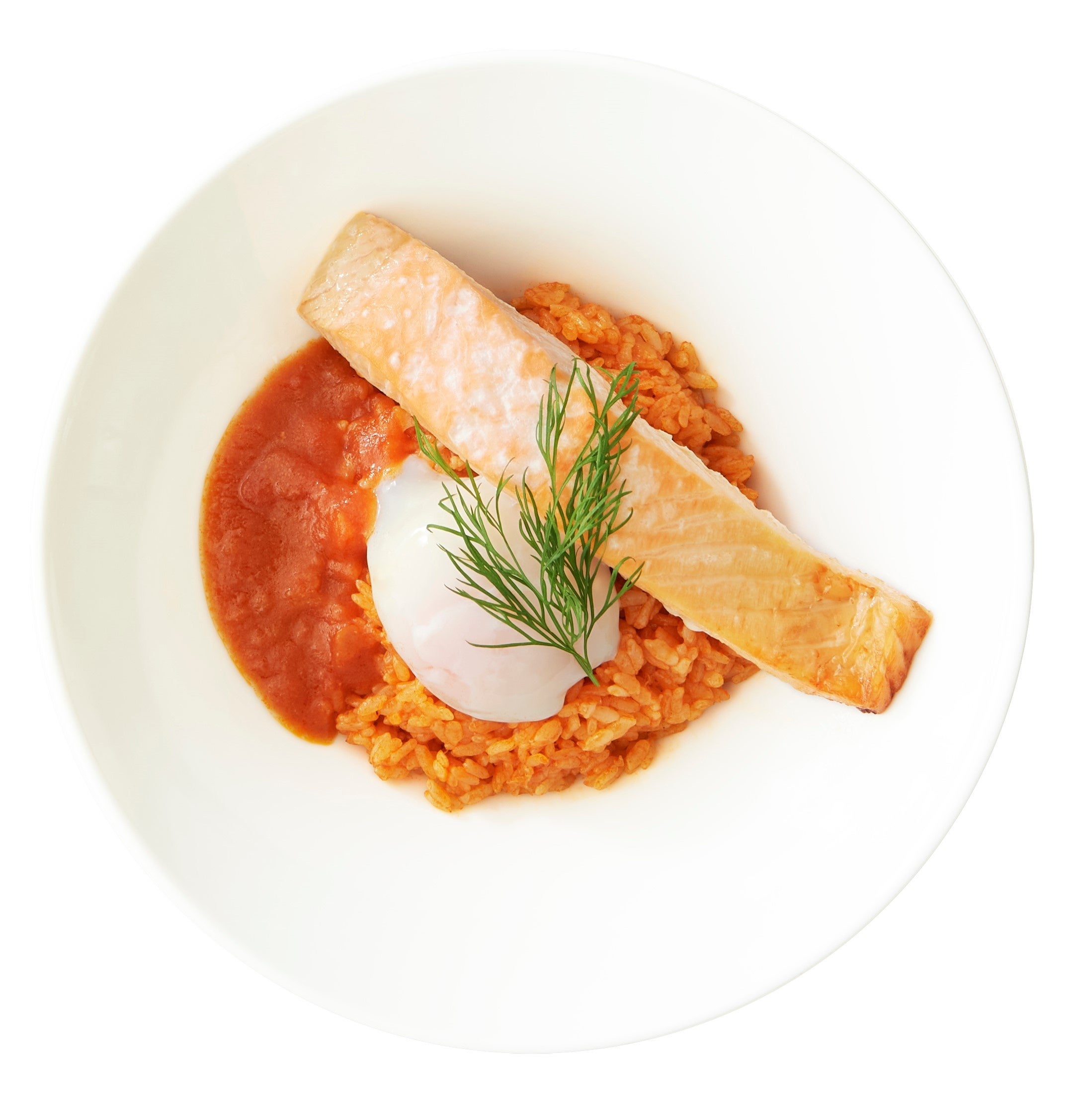 脂ののった厚めのサーモンフィレを、ケチャップライスの上にのせたボリューム満点の一品です。トマトソースと温泉卵をからめて召し上がれ。