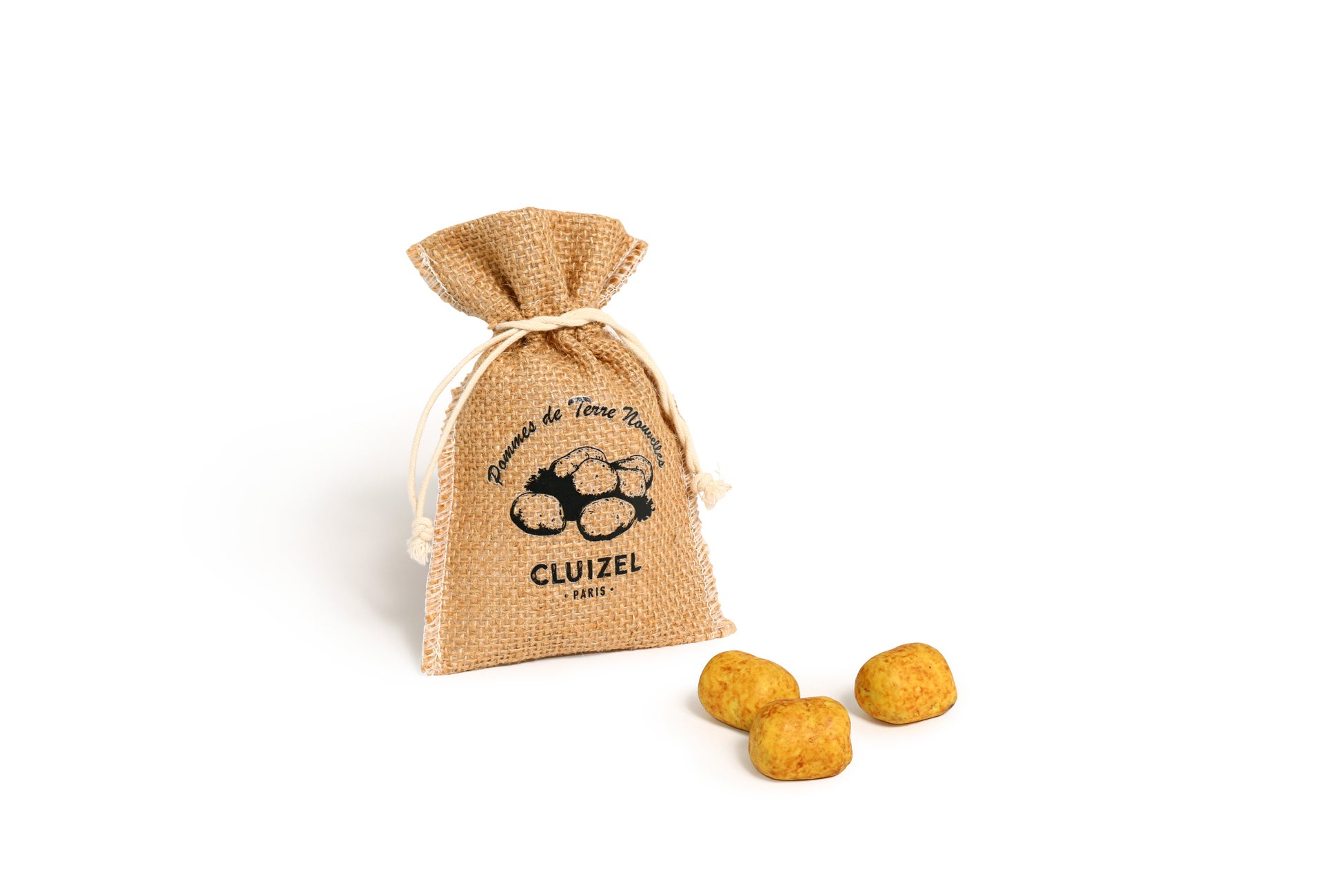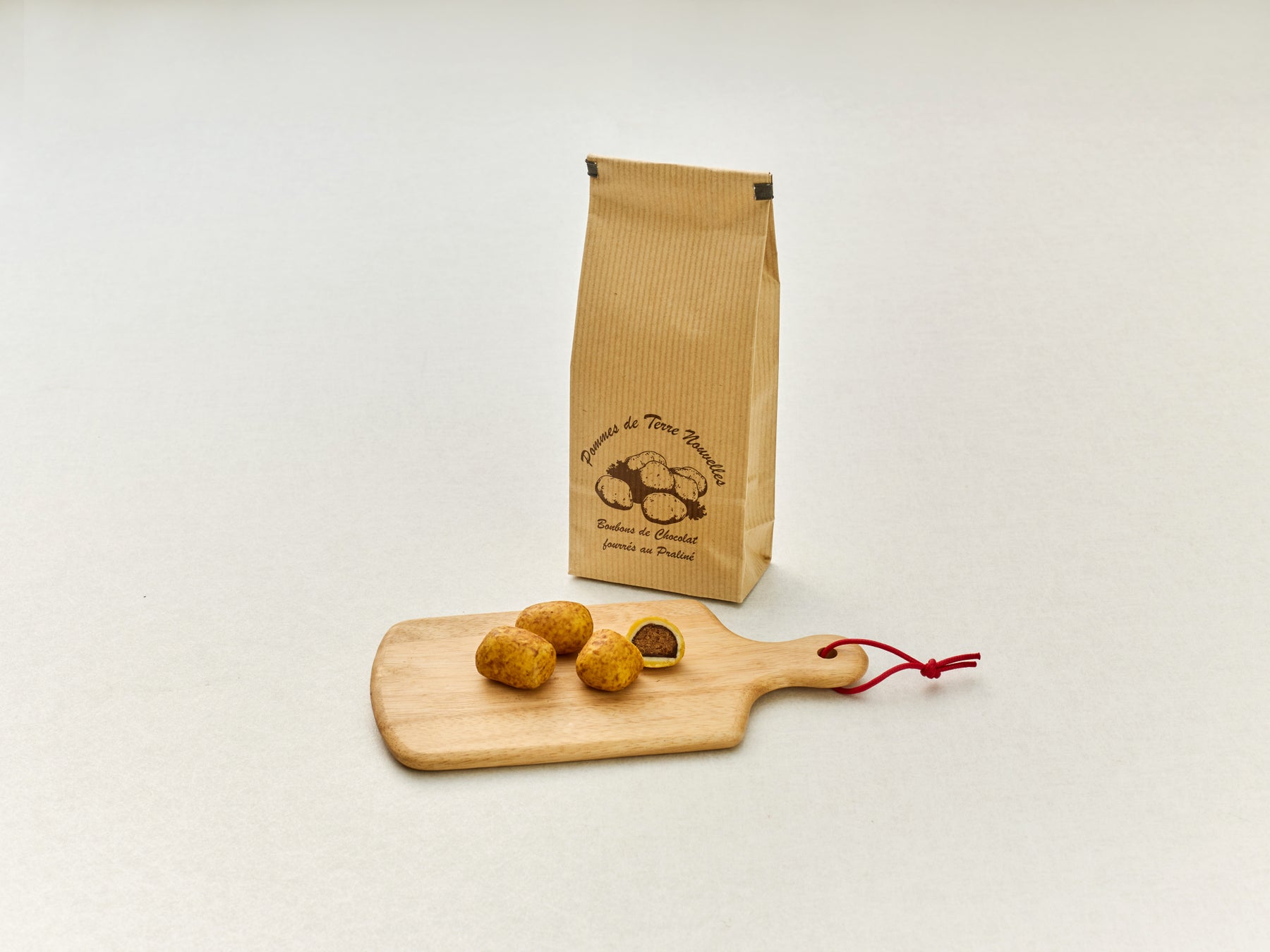 詳細:まるで本物のじゃがいもを再現したようなユーモアあふれるショコラ。表面のホワイトチョコレートの中に、ダークチョコレートの層を重ね、中心部のフィリングの中には薄く焼いたクレープ生地(フィアンティーヌ)をしのばせたシャリシャリ食感が斬新な味わい。麻の巾着袋入りでプチギフトにもおすすめです。