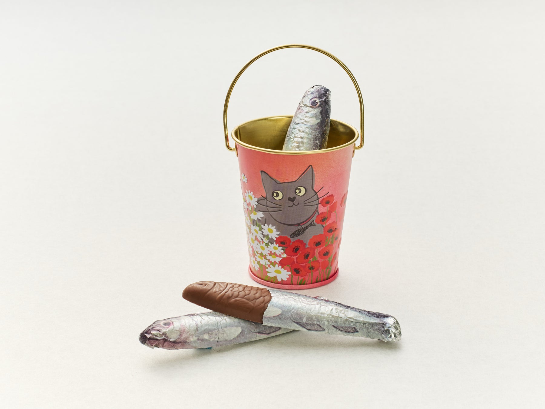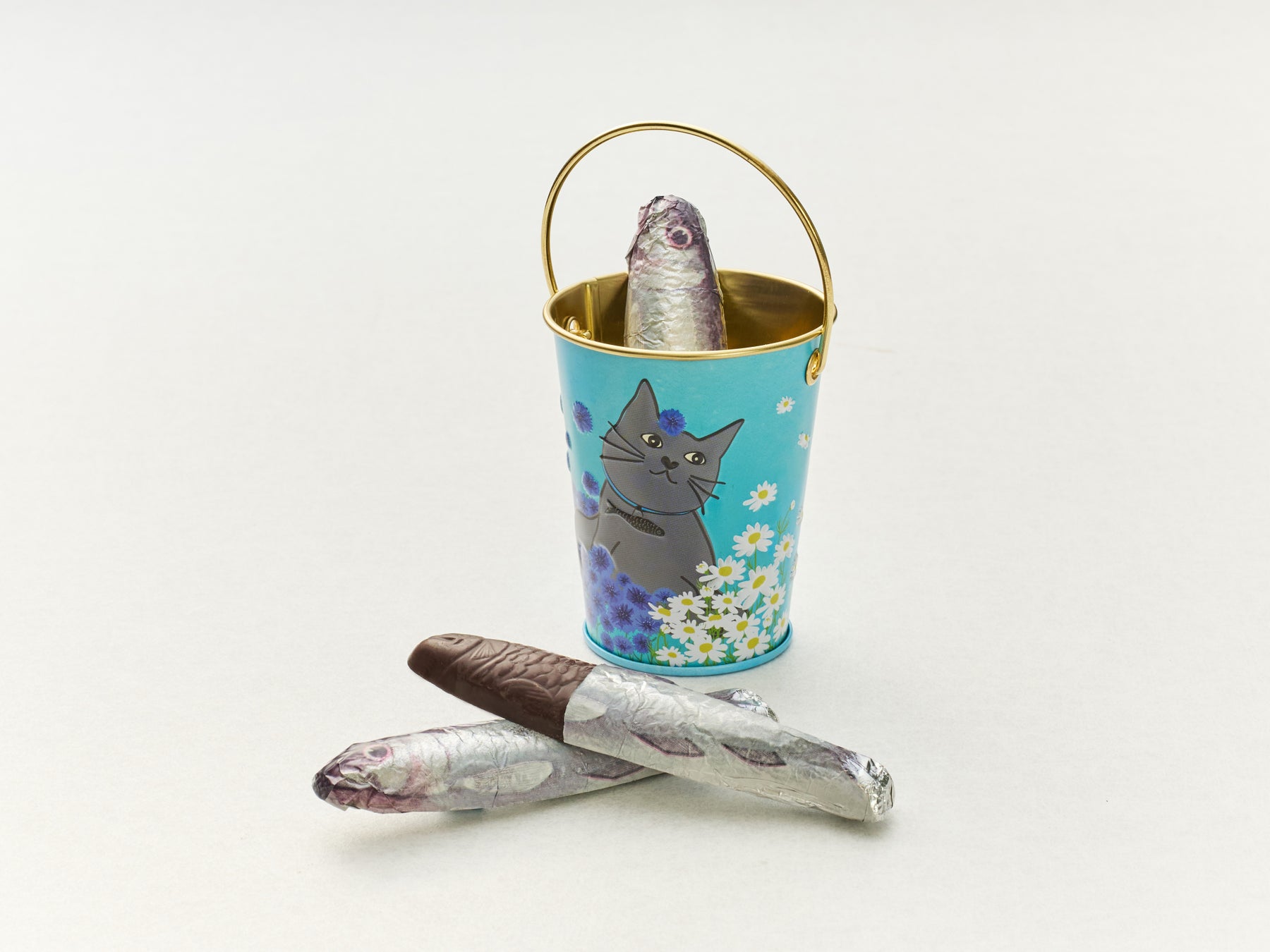 詳細:本物そっくりのサーディンがデザインされたユニークなホイルショコラ3本を、"国の宝″とも呼ばれるフランス原産のネコ(シャルトリュー)が描かれたバケツ缶にセット。フランスのトリコロールカラーのイメージの元となった、赤い花のヒナゲシ(コクリコ)にはミルクチョコレート、青い花の矢車菊 (ブルーエ)にはダークショコラがそれぞれ3本ずつ入っています。