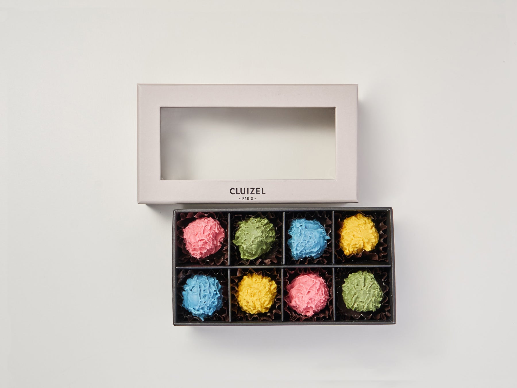 フォークを使って手作業でコーティングして「とがった」外観を与え、アルマニャック、ラズベリー、グランマルニエ、ウィリアムズ洋ナシなど、さまざまなフレーバーで作られます。可愛さのイメージから徐々に洋酒が大人の甘美な味わいを演出します。